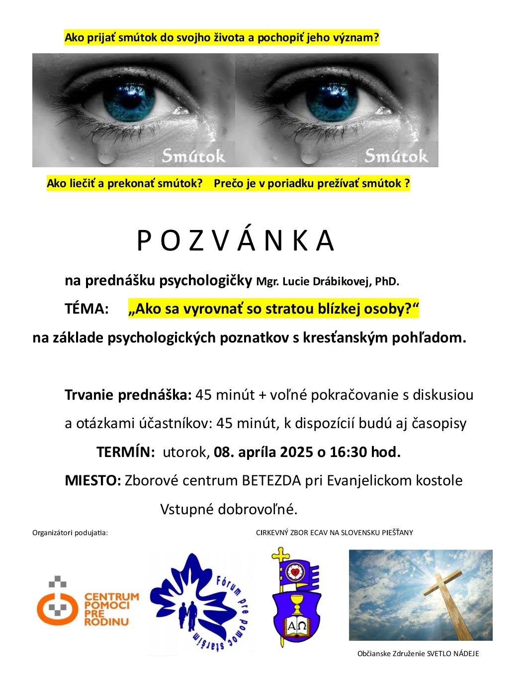 Ako prijať smútok do svojho života a pochopiť jeho význam? Ako liečiť a prekonať smútok? Prečo je v poriadku prežívať smútok? O týchto, ale aj mnohých ďalších veciach sa bude hovoriť v utorok 8. apríla v zborovom centre Betezda pri Evanjelickom kostole v Piešťanoch.