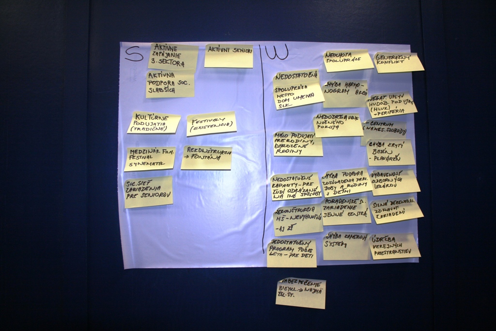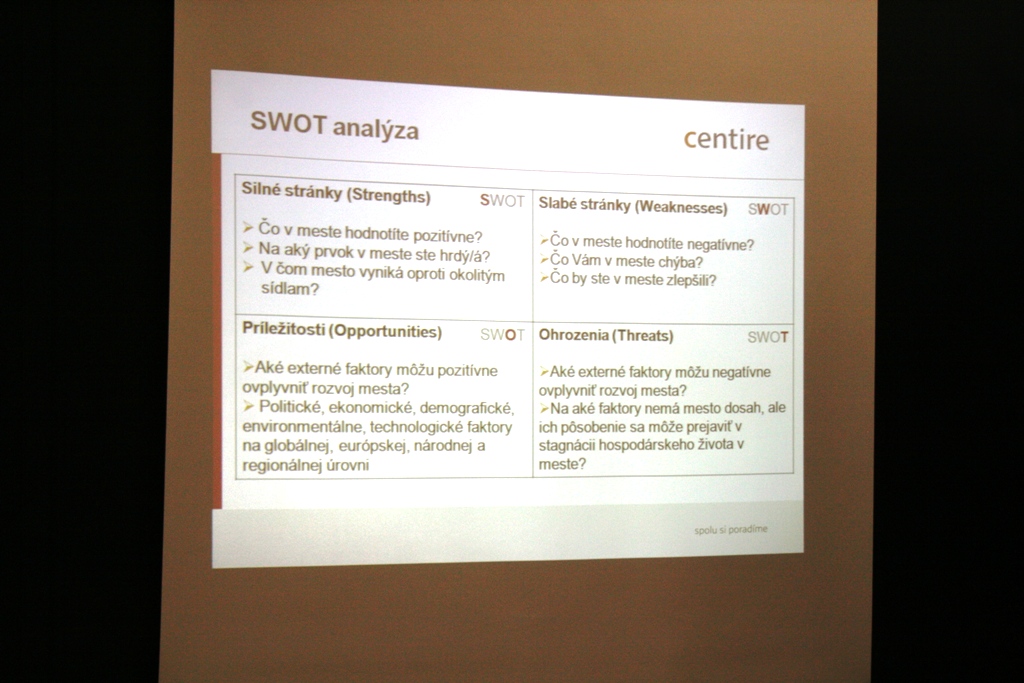 Do ohrození zasa zaradili napríklad legislatívu, týkajúcu sa ochrany prameňov či stárnutie populácie. Návrhy vyberali účastníci v troch skupinách podľa orientácie na oblasti – hospodársku, sociálnu a enviromentálnu. Najviac návrhov padlo v prvej skupine. V sociálnej oblasti sa medzi silnými stránkami ocitla aktivita seniorov a medzi slabými napríklad chýbajúci domov dôchodcov, či aktivity a zariadenia na podporu rodín s deťmi. Nápadov bolo, samozrejme, oveľa viac, avšak konečný výber zostane na pleciach tvorcov programu.