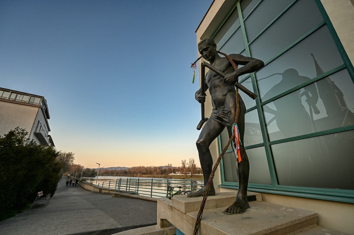 Svetoznámu sochu na priečelí Kolonádového mosta od piatka zdobí jeden zo symbolov Veľkej noci. Barlolámačovi niekto uplietol približne 6 metrov dlhý korbáč. Inštalácia je pre okoloidúcich atrakciou, fotia si ju a svojim známym posielajú originále veľkonočné priania z Piešťan.
