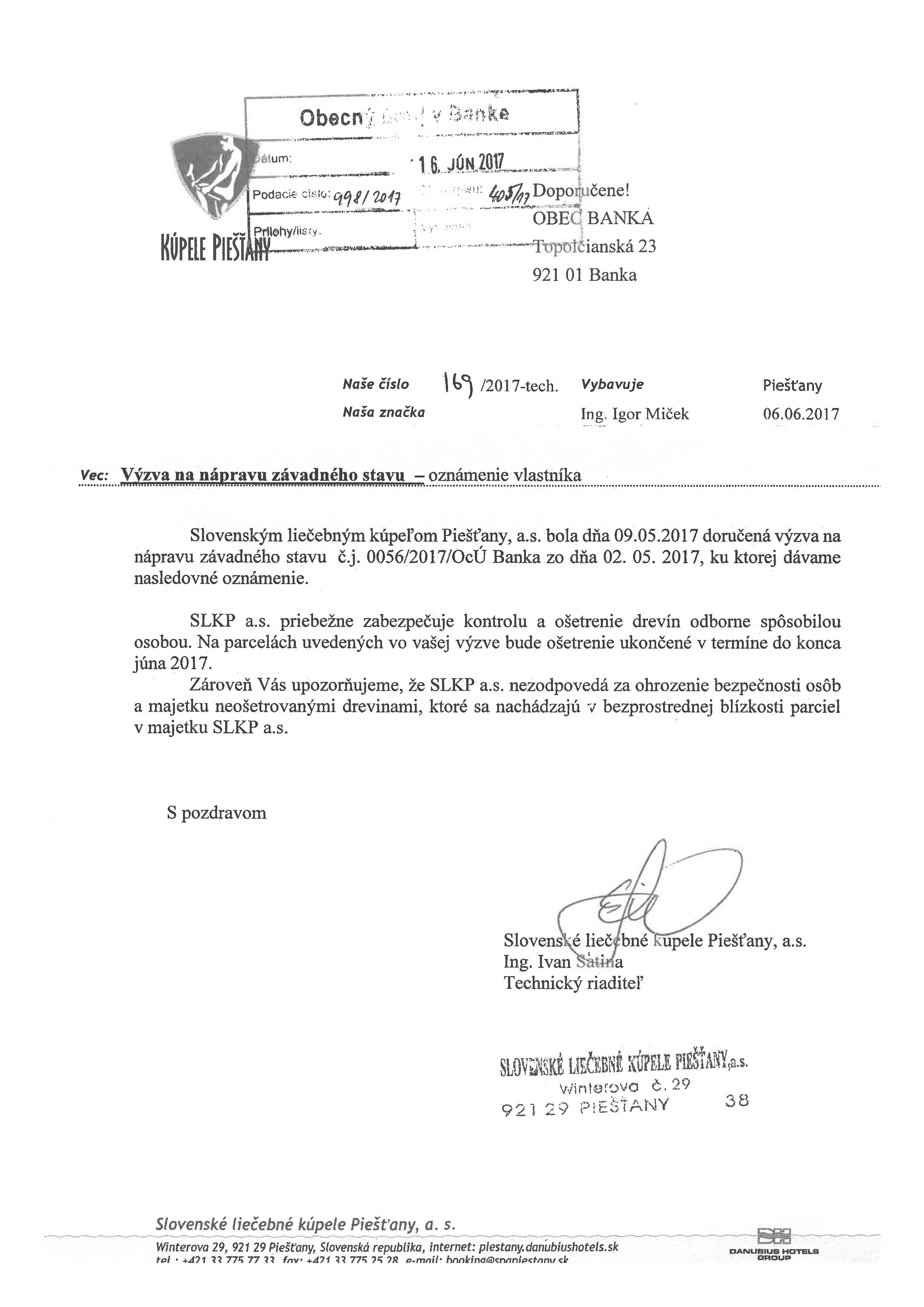 Praskajúce a padajúce stromy v Dominovej aleji na Banke poškodili už tento rok štyri autá – prvé si to odnieslo 19. apríla, ďalšie tri v stredu 28. júna. V oboch prípadoch stihli okoloidúci uskočiť a dreviny, našťastie, napáchali len materiálne školy. Po viacnásobných urgenciách zo strany starostky obce, obyvateľov i vďaka medializácii vyslali kúpele v piatok 30. júna na Banku arboristov.