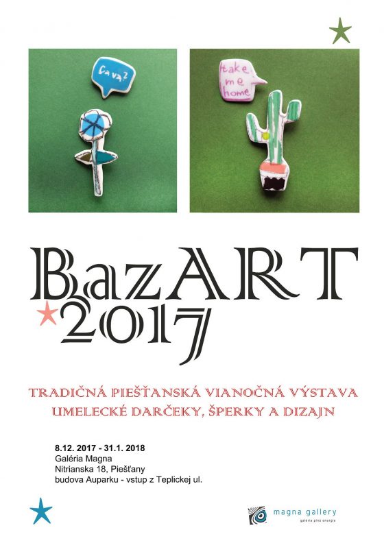 Vianočná výstava BazART predvedie i tento rok množstvo umeleckých predmetov a dizajnových darčekov, v piešťanskej Magna Gallery prebieha pravidelne v predvianočnom a novoročnom čase už od roku 2014. Záujemcovia a zberatelia si môžu pozrieť alebo investovať do súčasného slovenského umenia, šperkov a dizajnových výrobkov rôznych umelcov. Predajná expozícia bude prebiehať od piatka 8. decembra až do utorka 31. januára 2018.