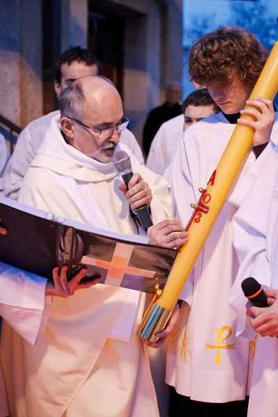 Najdlhšia cirkevná slávnosť začala obradom svetla. Farár Matej Kýška posvätil a zapálil pred kostolom sviecu paškál, symbolizujúcu Ježiša Krista ako svetlo sveta. Potom ju v sprievode miništrantov priniesol do zhasnutého kostola, ktorý postupne zaplnilo svetlo sviec odpálených od paškálu, následne sa rozozvučali aj zvony a oznámili celému svetu radostnú zvesť.
