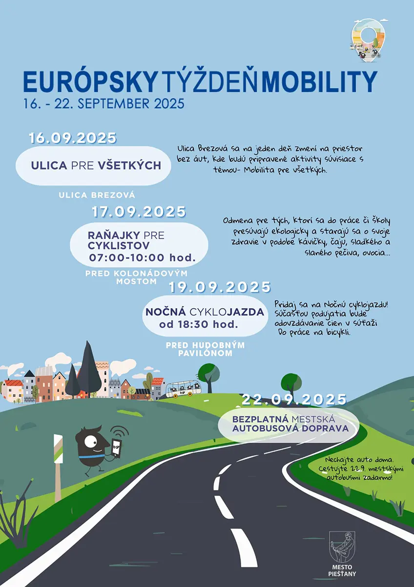 Piešťany sa do Európskeho týždňa mobility zapájajú po desiaty raz. „Tohtoročná téma „Mobilita pre každého“ je o rovnakom princípe, aký poznáme aj z dobrého kina – každý by mal mať prístup, nech je odkiaľkoľvek a nech má akékoľvek možnosti,“ informovali pracovníci mestského úradu.