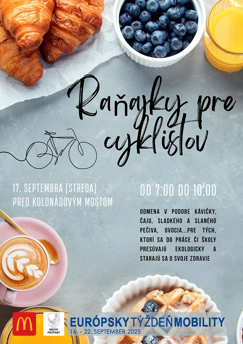 Mesto Piešťany sa v týchto dňoch zapája viacerými podujatiami do Európskeho týždňa mobility. Brezová ulica dnes bude pre všetkých okrem áut. Zajtra budú pripravené raňajky pre cyklistov pri Kolonádovom moste, v piatok si užijete nočnú cyklojazdu a nasledujúci pondelok má byť autobusová doprava zdarma.