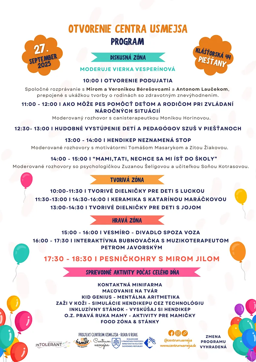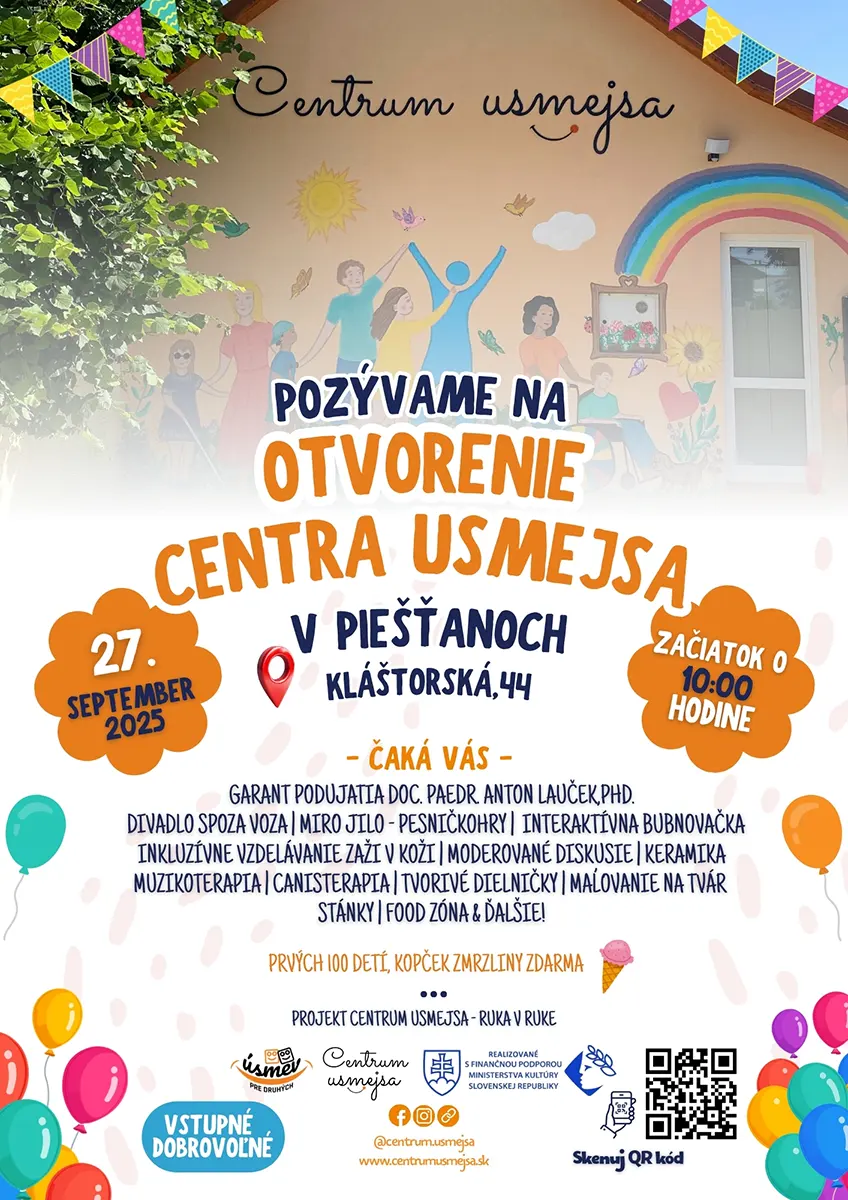 Centrum Usmejsa v Piešťanoch slávnostne otvoria v sobotu 27. septembra. Jeho zámerom je vytváranie komunitného miesta na stretávanie sa s prepájaním na pomoc a sociálne služby. Súčasťou je Domov sociálnych služieb a sociálny podnik, kde nájdu pracovné uplatnenie zdravotne znevýhodnení. K areálu patrí aj minifarma slúžiaca na hry, angažovanie sa a vzdelávanie.