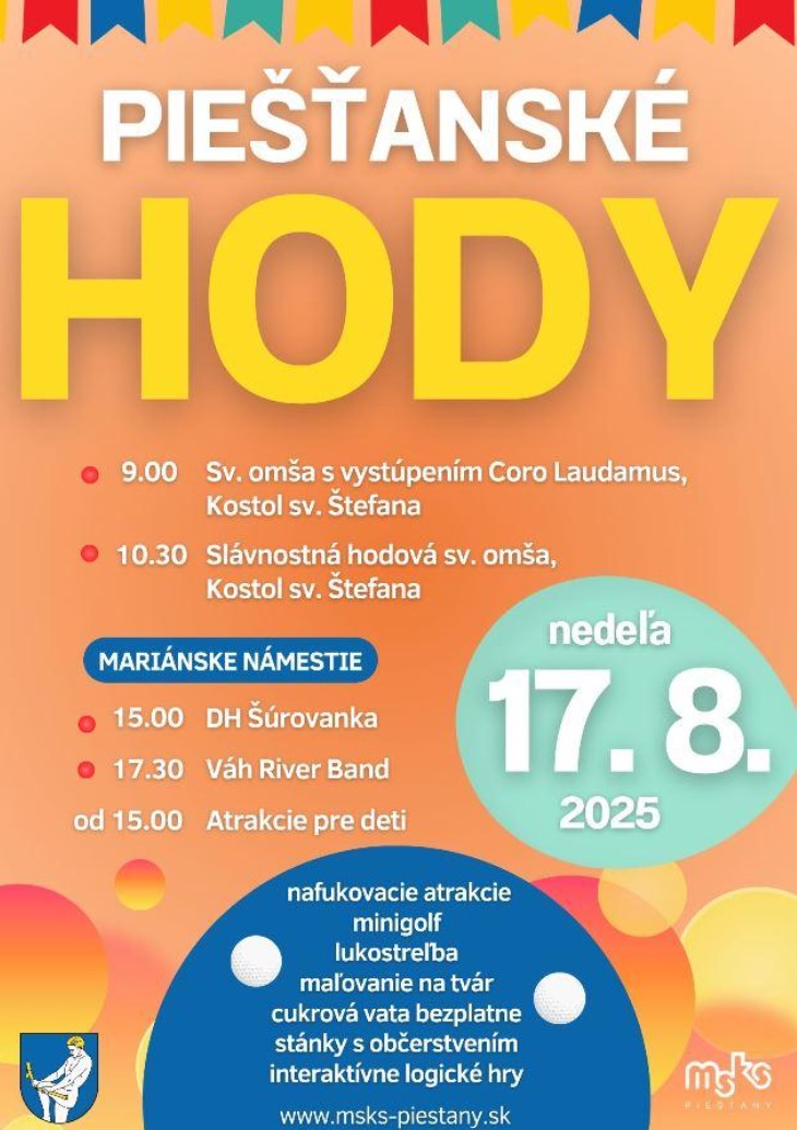 V sobotu 16. augusta je sviatok sv. Štefana Uhorského, patróna kostola a piešťanskej farnosti. Hody ako odpustová slávnosť sa uskutočnia v nedeľu 17. augusta, popoludní bude nasledovať program na Mariánskom námestí pripravený Mestským kultúrnym strediskom mesta Piešťany.