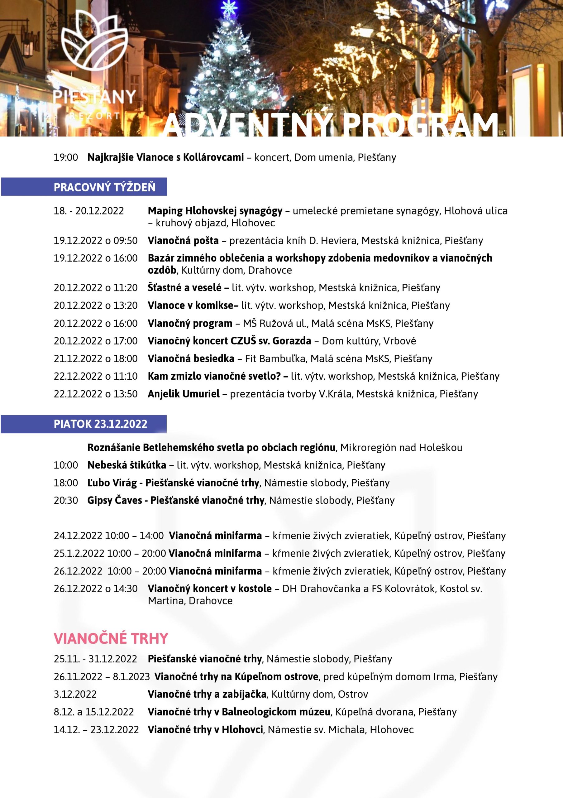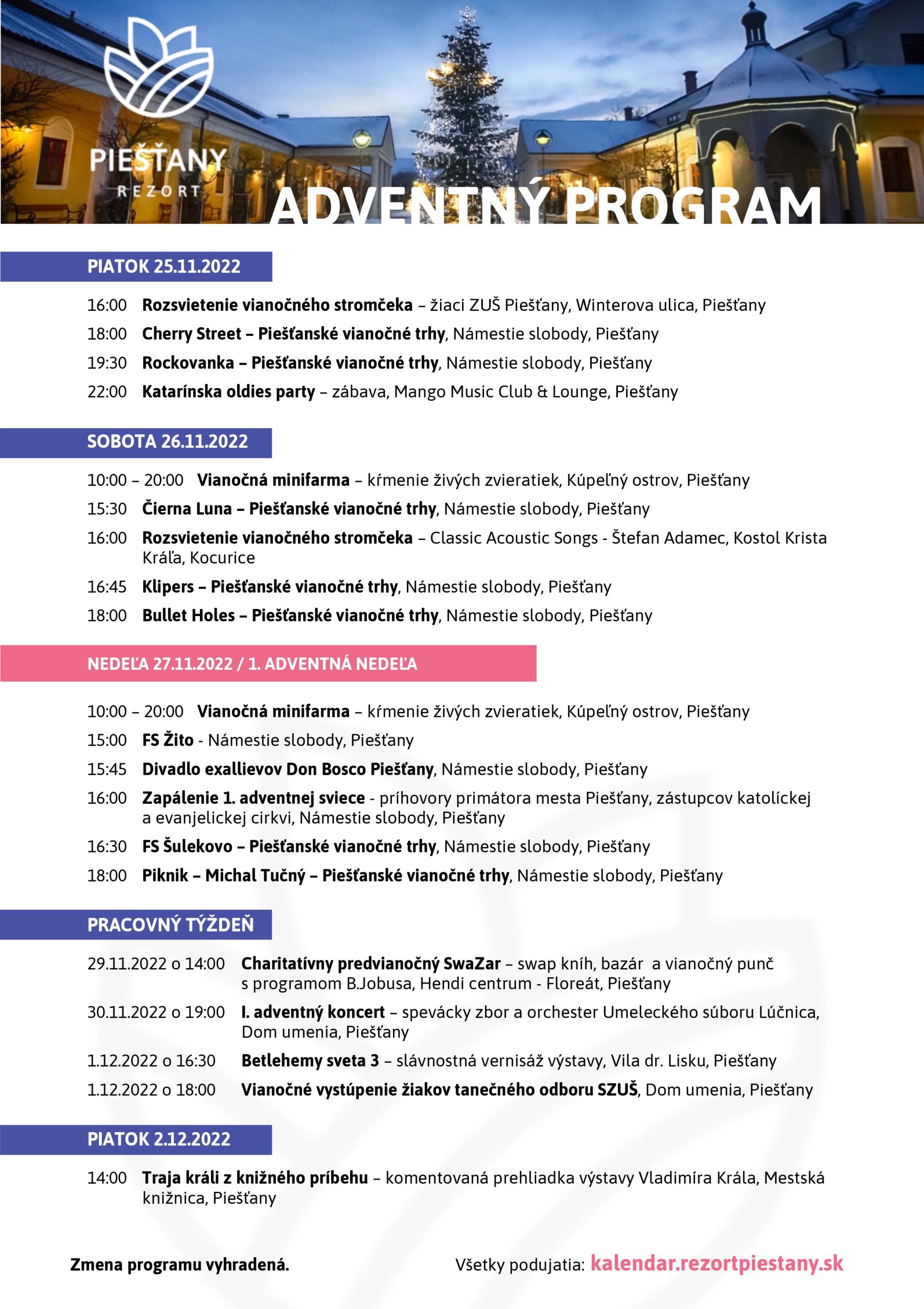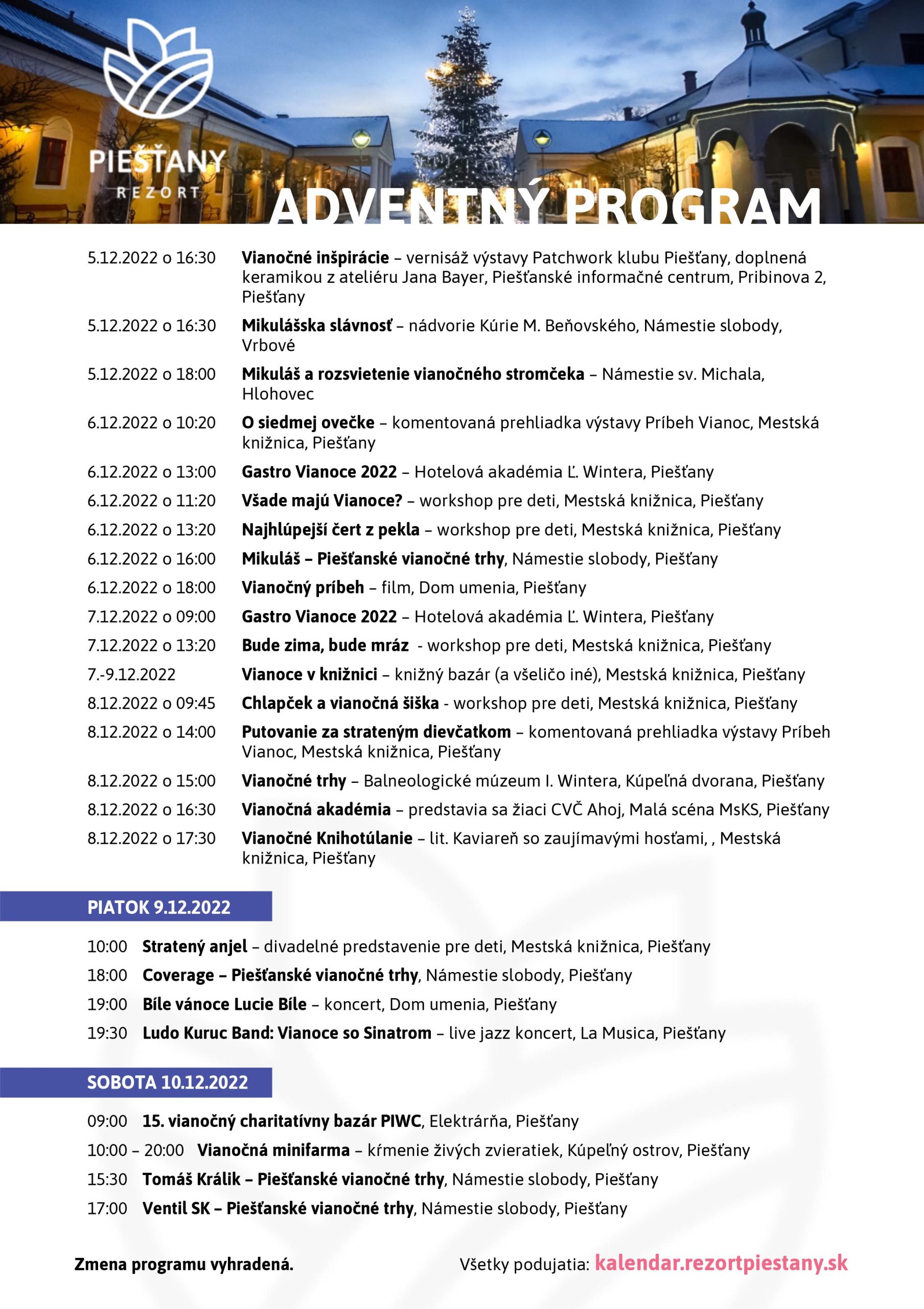 Piešťanská hotelová akadémia pripraví na Mikuláša a aj nasledujúci deň Gastro Vianoce 2022. Reštaurácia La Musica bude miestom živého džezového koncertu nazvaného Vianoce so Sinatrom. Slávnostný vianočný večer pripraví divákom v Dome umenia folklórny súbor Slnečnica a štvrtá adventná nedeľa bude v Dome umenia takisto patriť hudbe, a to koncertu Najkrajšie Vianoce s Kollárovcami. Nebude chýbať ani katarínska zábava a priaznivci zimného športu sa môžu zúčastniť na Roľničkovom behu a Nordic Walkingu na Havran.