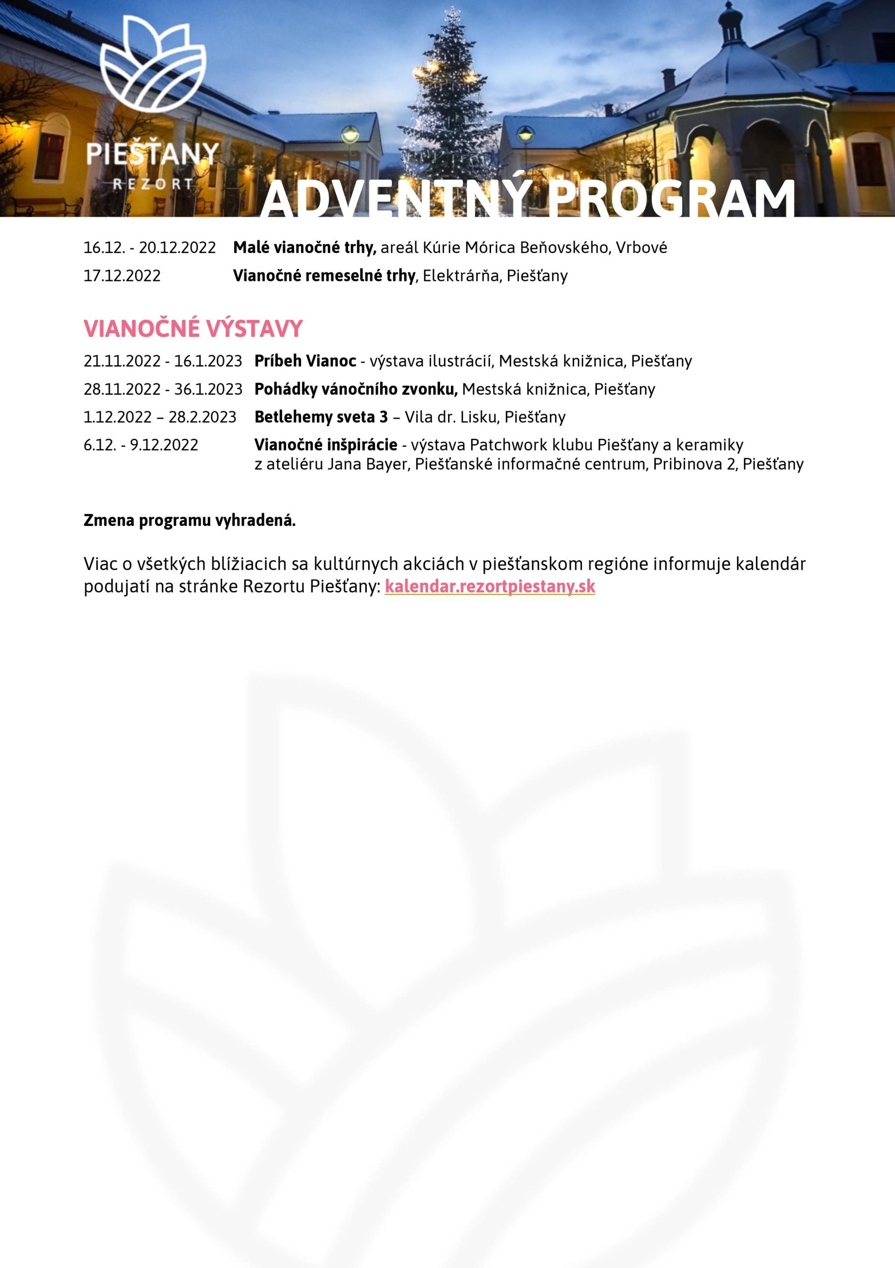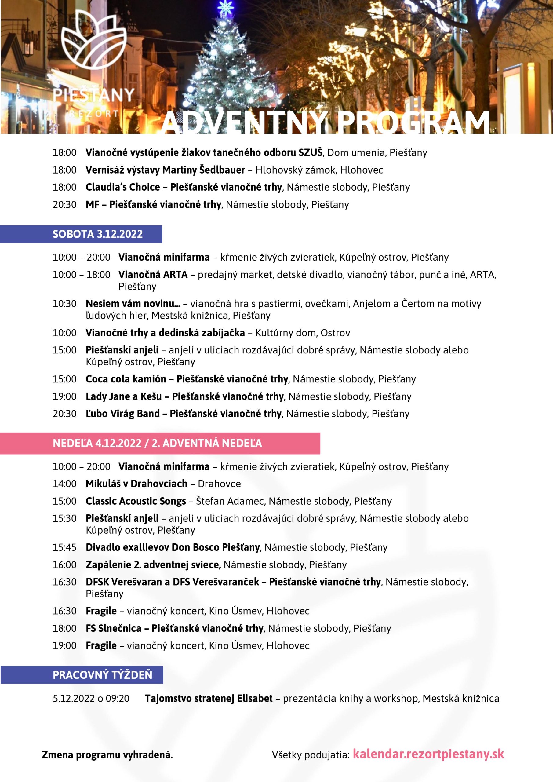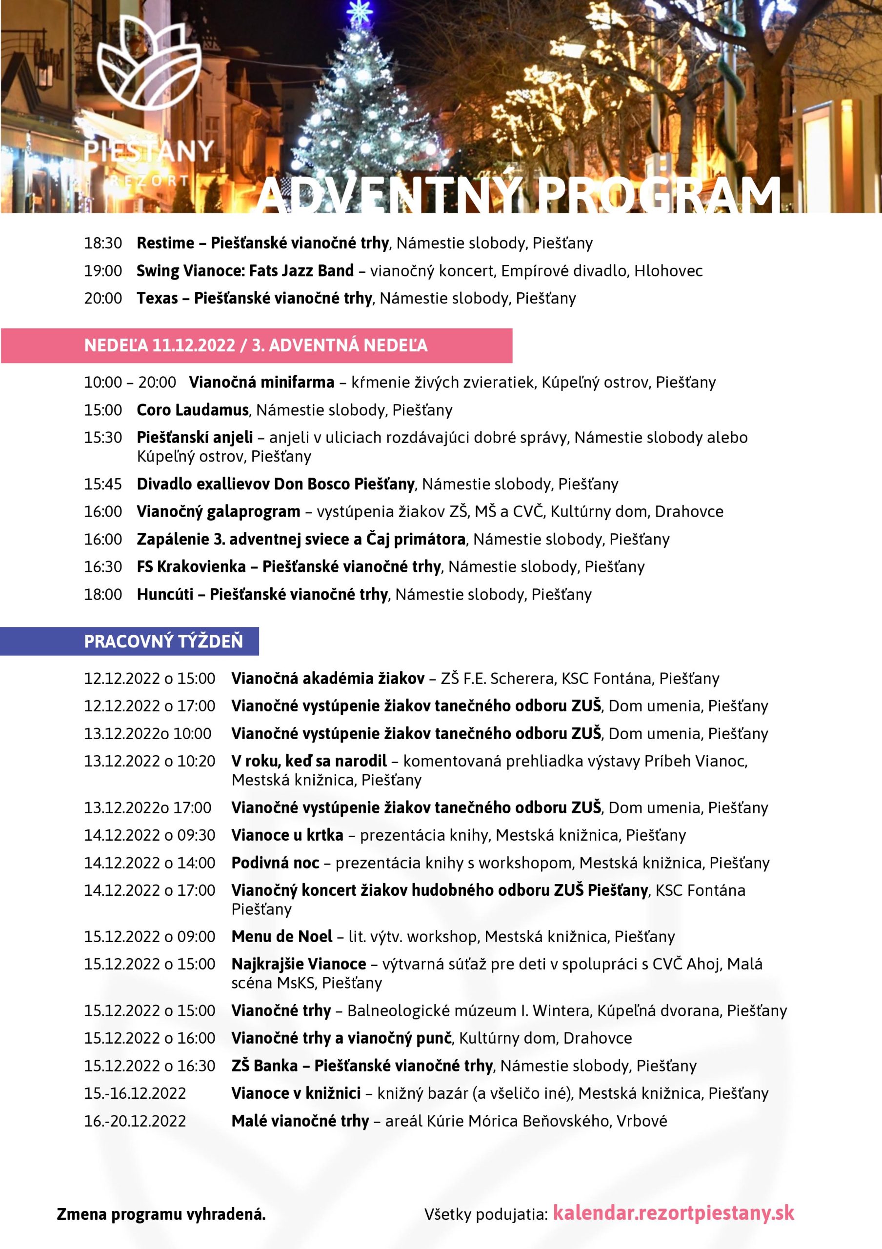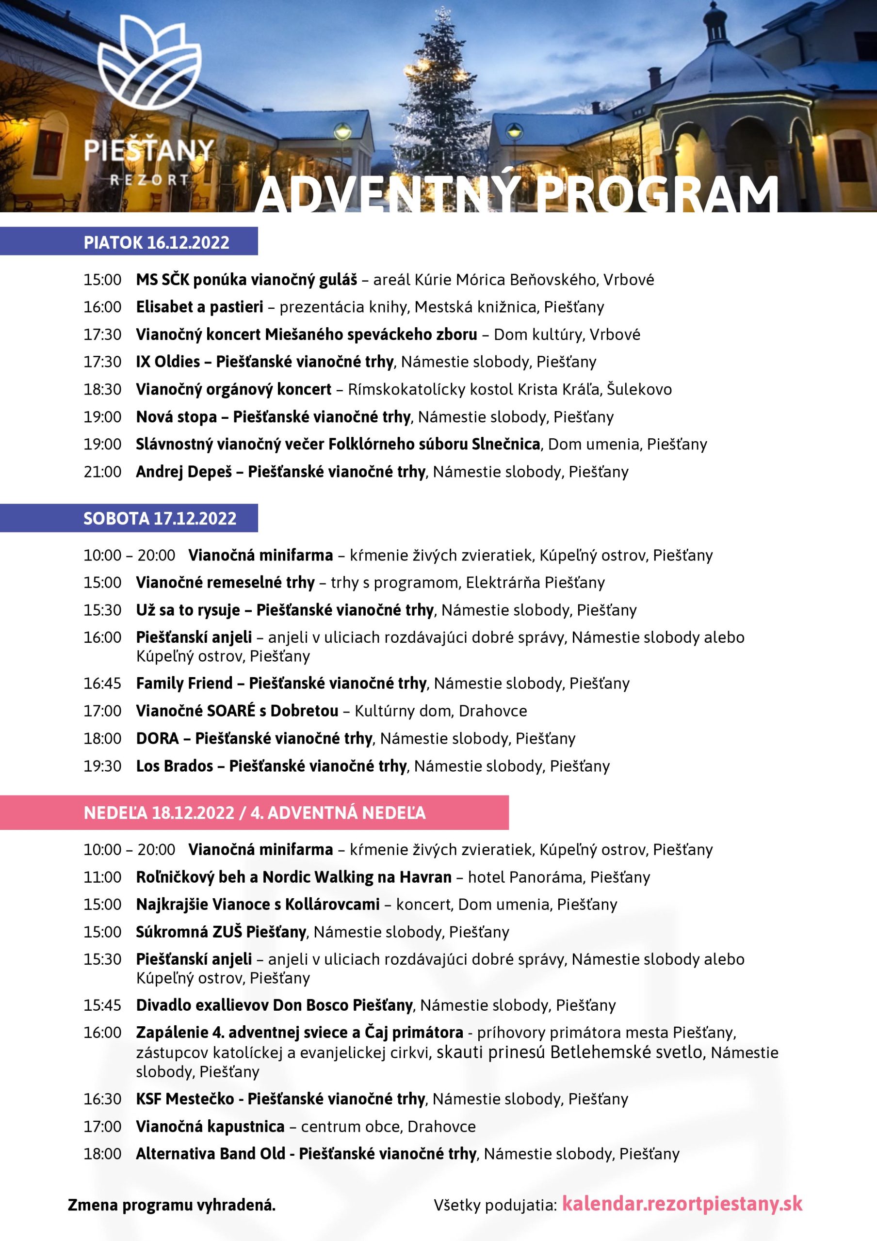 Piešťanská hotelová akadémia pripraví na Mikuláša a aj nasledujúci deň Gastro Vianoce 2022. Reštaurácia La Musica bude miestom živého džezového koncertu nazvaného Vianoce so Sinatrom. Slávnostný vianočný večer pripraví divákom v Dome umenia folklórny súbor Slnečnica a štvrtá adventná nedeľa bude v Dome umenia takisto patriť hudbe, a to koncertu Najkrajšie Vianoce s Kollárovcami. Nebude chýbať ani katarínska zábava a priaznivci zimného športu sa môžu zúčastniť na Roľničkovom behu a Nordic Walkingu na Havran.