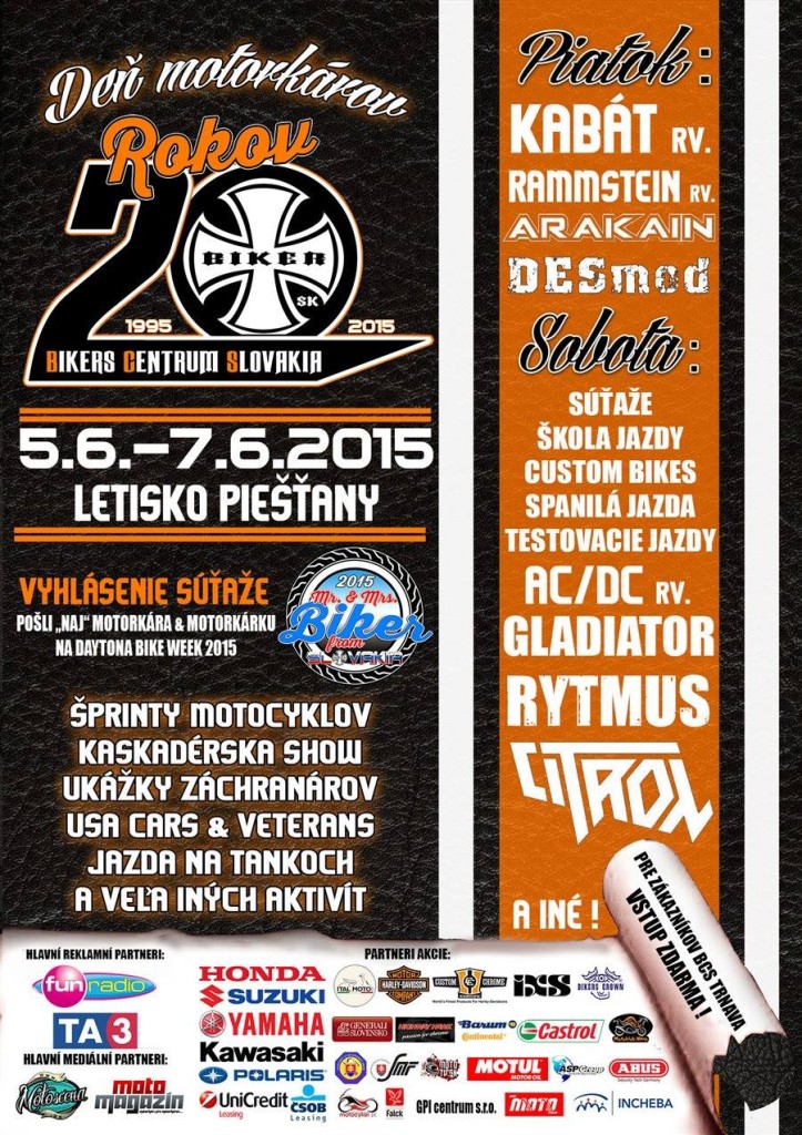 Od piatku 5. júna budú motorkárov baviť kapely ako Kabát či Rammstein revival ale i český Arakain a slovenský Desmod. V sobotu sa začínajú súťaže, škola jazdy, Custom bikers, spanilá jazda a testovacie jazdy. Okrem nich si návštevníci budú môcť pozrieť šprinty motocyklov, kaskadérsku šou či jazdu na tankoch. O hudobný doprovod sa postará AC/DC revival. Večer vyvrcholí vystúpením kapely Gladiátor a po nej príde piešťanská hviezda Rytmus.