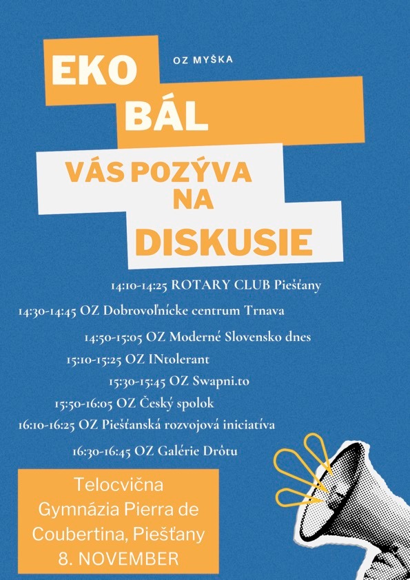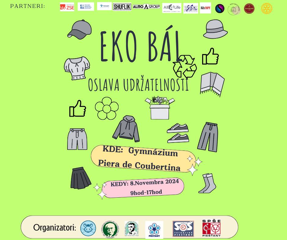 V piatok 8. novembra sa v priestoroch Gymnázia Pierra de Coubertina uskutoční Eko Bál, ktorý má byť oslavou udržateľnosti. Do akcie sa zapájajú študenti zo všetkých piešťanských stredných škôl, ktorí zbierali v uplynulom období oblečenie, knihy, hračky, či školské potreby. Tie budú použité v rámci bazáru počas akcie. Uskutočniť sa majú tiež kreatívne programy, či zaujímavé prednášky.