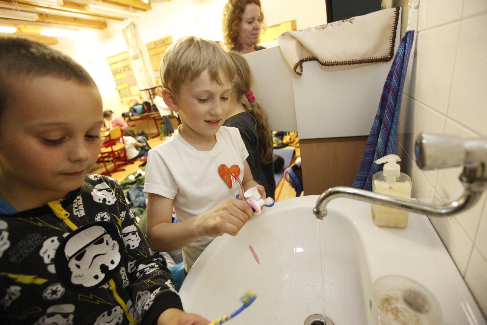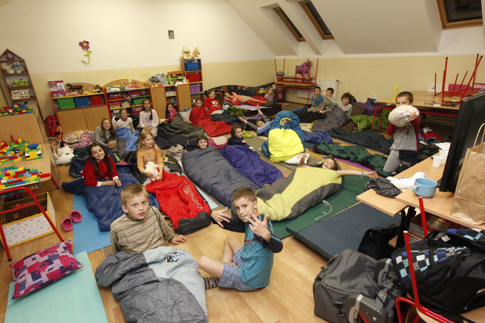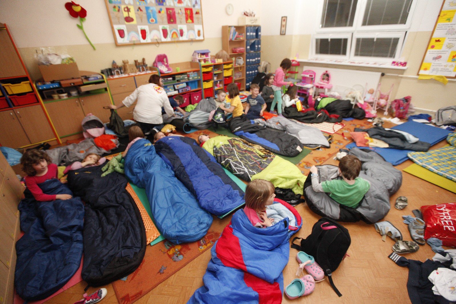 Nasledovalo prekvapenie a po ňom veľká príprava na nocľah v triedach. Postele nahradili karimatky, periny spacáky, namiesto kúpeľne stačilo triedne umývadlo. Na dobrú noc sa prišli ešte rozlúčiť sestričky, ale deťom, plným zážitkov, sa príliš spať nechcelo.