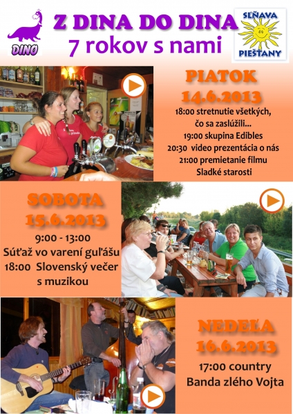 Séria akcií pripomínajúcich 7. narodeniny Dina odštartuje v piatok 14. júna večer. Pripravené je vystúpenie skupiny Edibles, videoprezentácia aj premietanie filmu Sladké starosti. Na druhý deň bude na Dine už od rána rozvoniavať guláš. Opäť sa tam zídu najlepší kuchári z okolia, aby súťažili vo varení tejto tradičnej pochúťky. O 18.00 h začne Slovenský večer s Ľudovou hudbou Petra Obucha a domácimi špecialitami. V nedeľu od 17.00 h sa o zábavu postará Banda zlého Vojta.