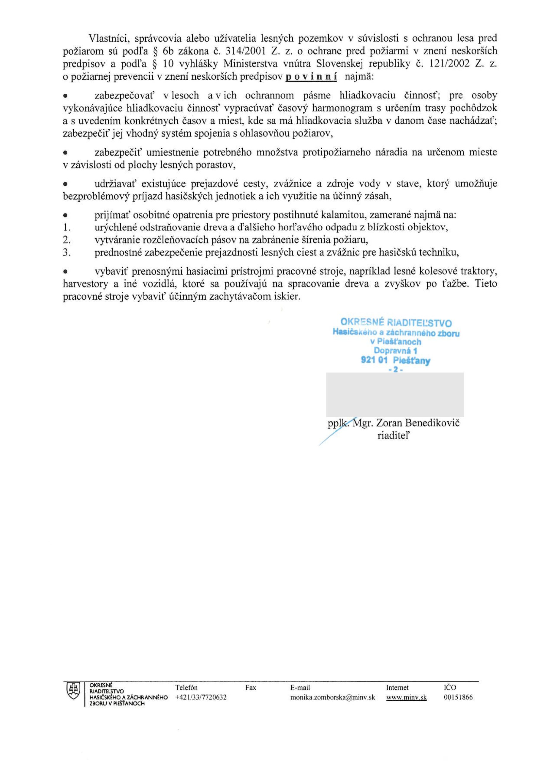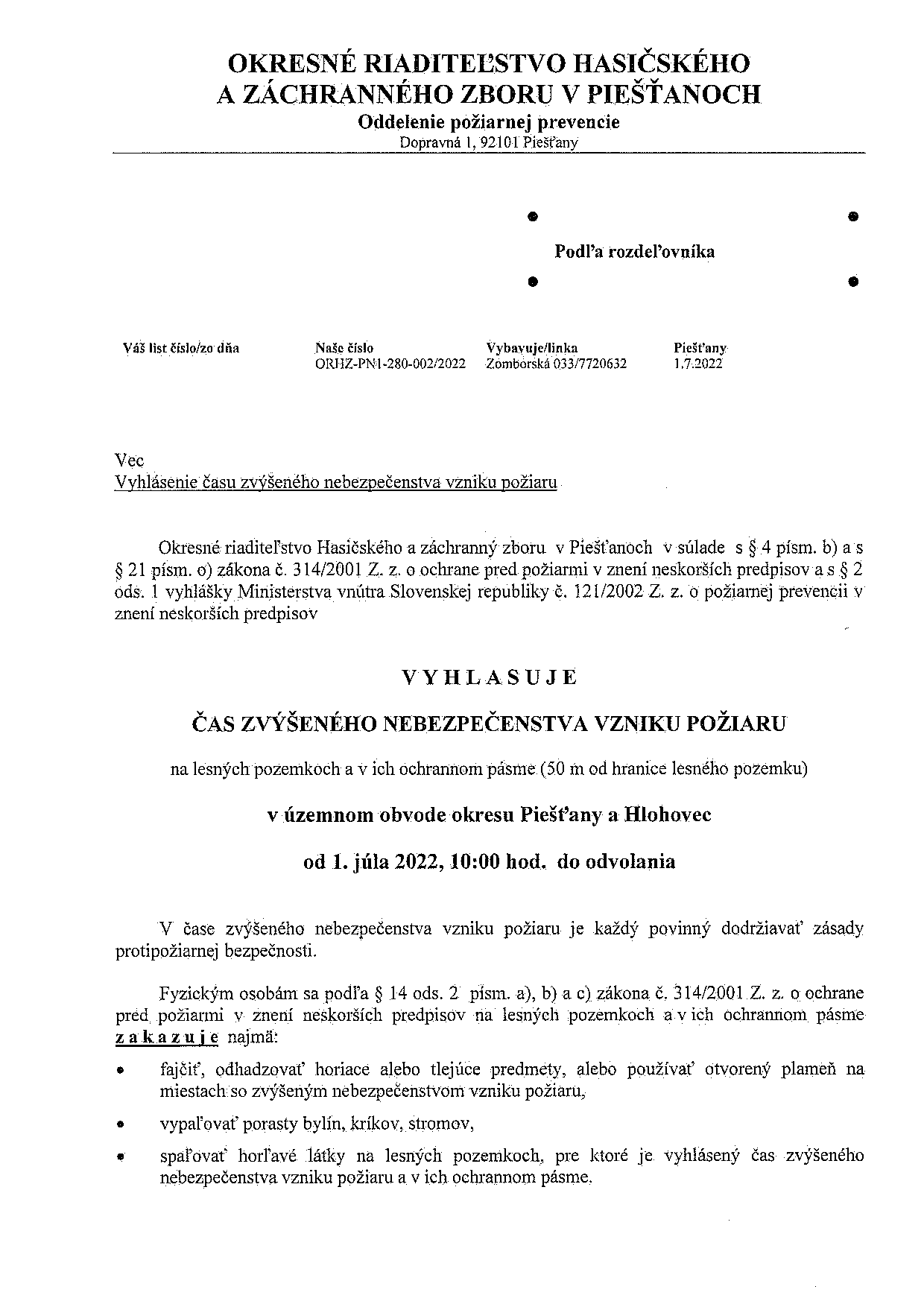 Od začiatku júla je v piešťanskom okrese, ale aj v ďalších okolitých, vyhlásený čas zvýšeného nebezpečenstva vzniku požiaru, keď sa na lesných pozemkoch a v ich 50-metrovom ochrannom pásme nesmie zakladať oheň, ale taktiež fajčiť a odhadzovať tlejúce predmety.