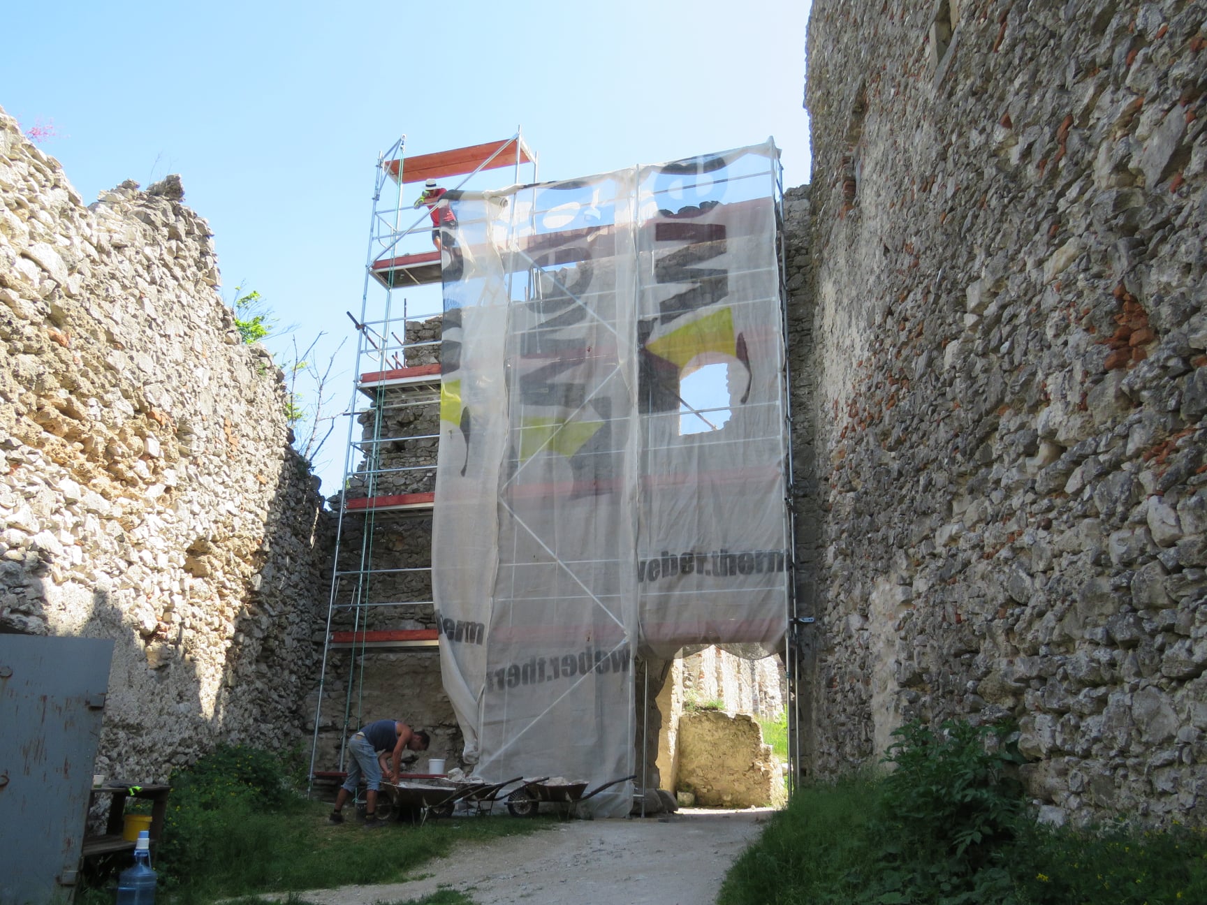 – konzervácia historických murív severného paláca, južného paláca a bránovej veže dobovou technikou riadkovaním