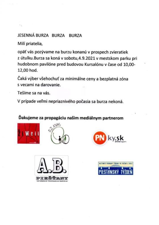 V sobotu 4. septembra si budete môcť vybrať z burzovej „všehochuti“ a podporiť piešťanský útulok, ktorého pracovníci sa starajú o opustených psíkov i mačky. Jesenná burza v prospech zvieratiek sa uskutoční pred budovou Kursalonu v Mestskom parku od 10:00 h do 12:00 h.