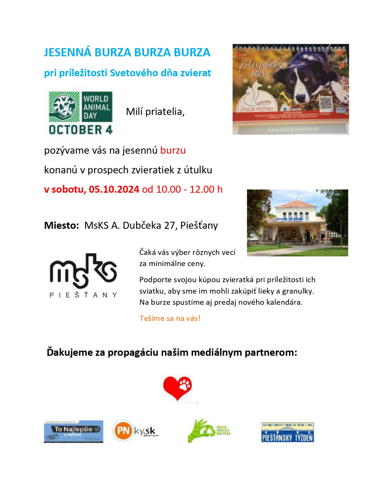 Jesenná burza v prospech zvieratiek z piešťanského útulku pri príležitosti Svetového dňa zvierat sa uskutoční v sobotu 5. októbra od 10:00 h do 12:00 h.