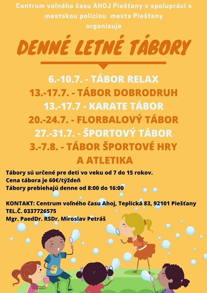 Rodičia tiež môžu prihlásiť deti na letné tábory, ktoré organizuje AHOJ v spolupráci s mestskou políciou. V ponuke je šesť druhov päťdňových turnusov s prevažne pohybovými aktivitami. Prvý začína od pondelka 6. júla, posledný končí 7. augusta.