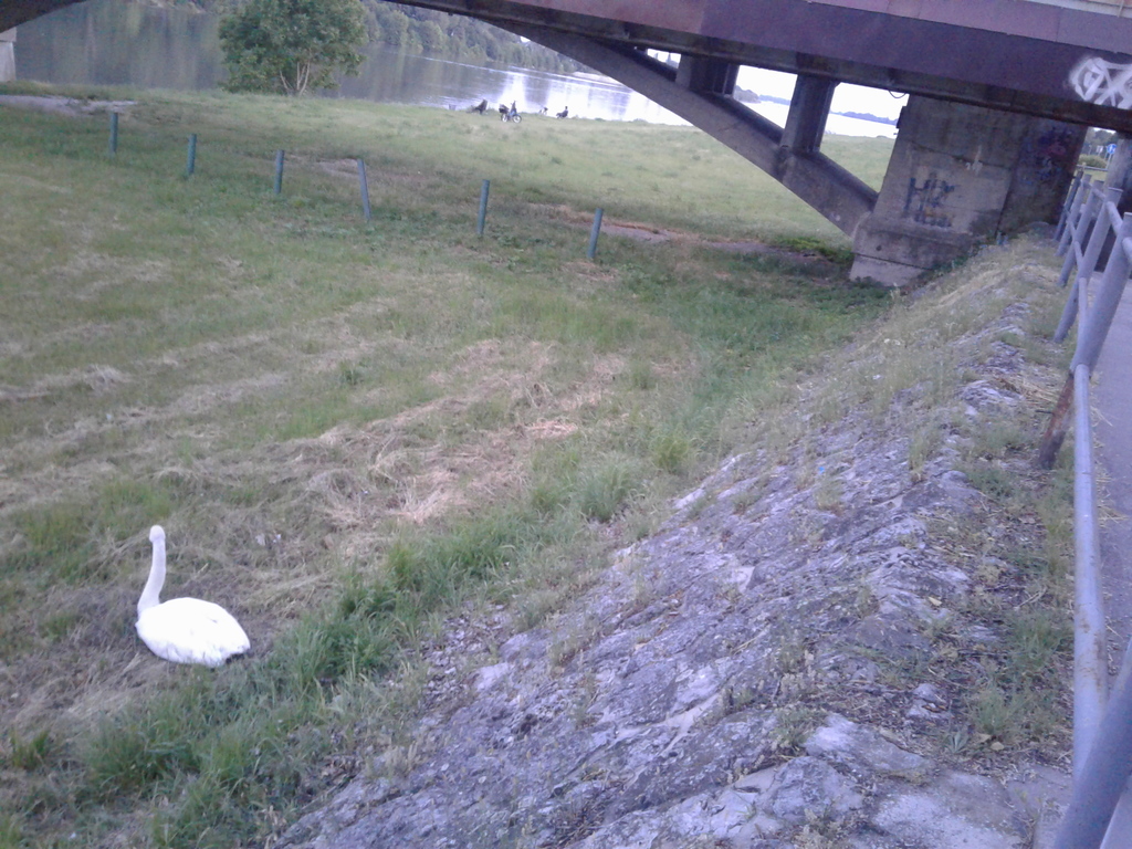 O ďalšiu, tento raz dospelú labuť, sa museli postarať 12. júna. Všimli si ju Piešťanci prechádzajúci sa po nábreží Váhu. Sedela na berme v blízkosti Krajinského mosta a správala sa čudne. „Podľa telefonátu bola na jednom mieste bez pohnutia viac hodín. Veliteľ zmeny o prijatom ozname informoval telefonicky ornitológa Tibora Šnajdara. Labuť obhliadla motorizovaná hliadka, ktorá vonkajšie zranenia nezistila,“ informoval Marcel Mihalik, náčelník Mestskej polície v Piešťanoch. Ešte v ten večer labuť T. Šnajdar odchytil a previezol do záchrannej stanice v Ratnovciach.