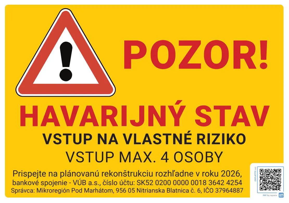 „Vyhliadková rozhľadňa na Marháte je v súčasnosti v havarijnom stave. Vstup je len na vlastné riziko a max. 4 osoby!“ informovali predstavitelia obce pred niekoľkými dňami na sociálnych sieťach.