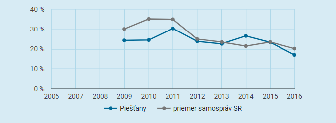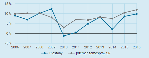 Mestu Piešťany sa podarilo v minulom roku znížiť celkový dlh na 17,05 percenta. Podľa hodnotenia Inštitútu pre ekonomické a sociálne reformy INEKO malo najväčšiu zadĺženosť v rokoch 2011, kedy dlh dosiahol až 30,3 percenta, prudký nárast nastal aj v roku 2014, kedy sa dlh vyštveral na 26,6 percenta. V spomenutých rokoch stagnovala aj bilancia bežného účtu mesta, ktorá vypovedá teda o tom, ako dokáže samospráva pokrývať svoje bežné výdavky.