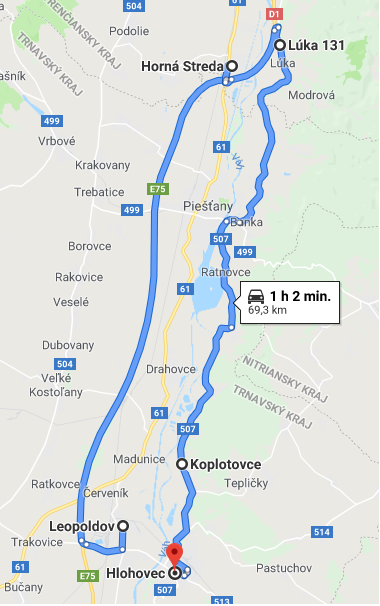 Šulekovo (cesta II/513)– Leopoldov (cesta III/1319) – Drahovce (cesta I/61) – Piešťany, Nové Mesto nad Váhom( cesta I/61) – Rakoľúby ( cesta II/515) – Hrádok, Lúka, Banka (cesta II/507) – Ratnovce, Sokolovce, Jalšové, Koplotovce (cesta II/507) – Hlohovec