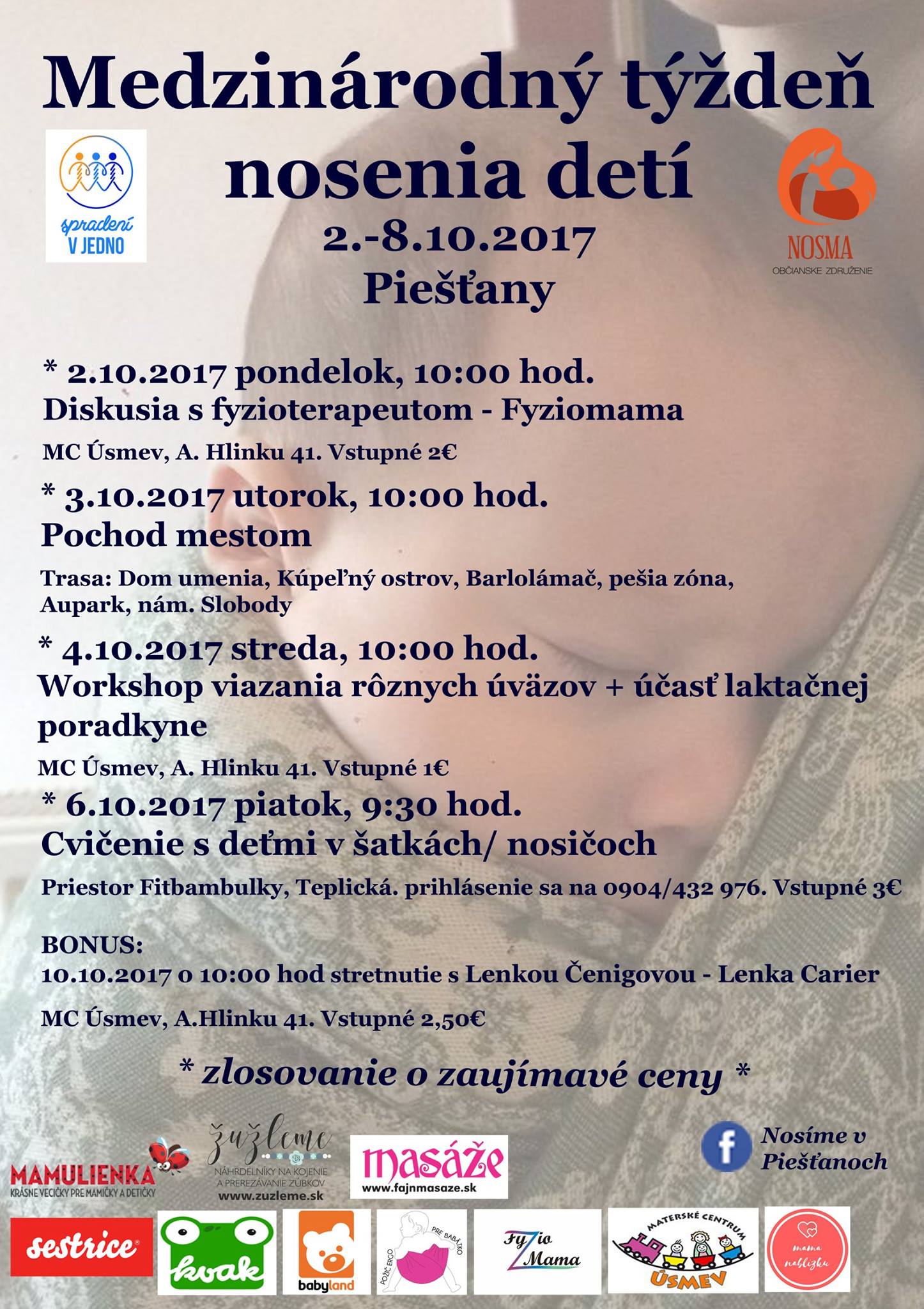 Tohtoročný prvý októbrový týždeň bude patriť opäť noseniu. Už po piaty raz spojí nosiacich rodičov a ich detičky obľúbené podujatie Medzinárodný týždeň nosenia detí. Aj ulice Piešťan zaplnia po druhý krát ženy a muži so svojimi deťmi v šatkách a nosičoch, aby spoločne oslávili radosť, ktorú nosenie prináša. Program je skutočne bohatý, ani tento rok nebude chýbať sprievod, podporné stretnutia, cvičenie s deťmi v šatkách a nosičoch, workshop ale ani súťaže o krásne a hodnotné ceny.