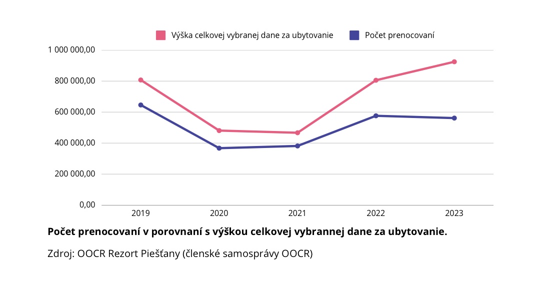 V roku 2023 sa na území členských samospráv Rezortu Piešťany vyzbieralo 924 740,60 eur na dani z ubytovania. Z toho až 98,4 percenta v Meste Piešťany. Vybratá daň za ubytovanie aj tržby v členských samosprávach boli vlani vyššie ako v predpandemickom roku 2019. Počet návštevníkov ani počet prenocovaní, však hodnoty z roku 2019 neprekonali. Naopak počet prenocovaní mierne klesol aj medziročne.