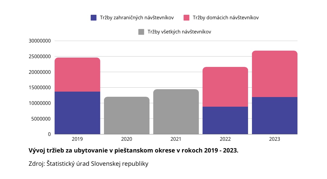 V roku 2023 sa ubytovalo v členských samosprávach viac ako 123-tisíc návštevníkov, čo je v porovnaní s predpandemickým rokom 2019 pokles o 8 percent, no v porovnaní s rokom 2022 ide o mierny nárast. Oproti roku 2022 prišlo aj k nárastu tržieb, pričom tržby zahraničných návštevníkov tvorili 44,63 percenta z celkových tržieb a tržby domácich návštevníkov 55,37 percenta z celkových tržieb okresu. „Keď si však porovnáme, že 68 percent zo všetkých domácich návštevníkov vytvorilo tržby vo výške 55,37 percenta a 32 percent zahraničných návštevníkov vytvorilo 44,63 percenta celkových tržieb, potom je zrejmé, že je dôležité orientovať sa i naďalej na zahraničné trhy, nakoľko do destinácie prinášajú viac peňazí,“ upozornil Michal Bezák, predseda predstavenstva Rezortu Piešťany.