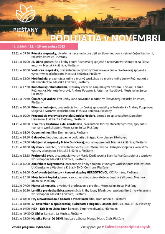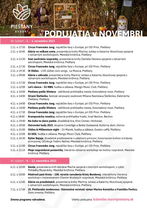 „Srdečne všetkých pozývam na jedinečné novembrové podujatia, ako je napríklad Hradná zabíjačka so sprievodným programom na hrade Beckov alebo na Galavečer, hudobno-zábavné podujatie plné šlágrov, ktoré sa bude konať v hlohovskom Kine Úsmev.“ informuje výkonná riaditeľka Rezortu Piešťany Tatiana Nevolná. „Zábavy bude v novembri v našom regióne ešte oveľa viac. V obci Ostrov sa budú konať Ostrovské hody 2023, na ktorých vystúpi i Beáta Dubasová, hody organizuje aj obec Drahovce. Piešťanský Mango Music Club ponúkne skvelú klubovú zábavu, november bude bohatý aj na koncerty. V kultúrnom centre Fontána vystúpi Tereza Mátlová a Daniel Hulka, v centre Arta zasa medzinárodné zoskupenie TIMBER RATTLE a Analogrunner, Empírové divadlo v Hlohovci pozýva na koncert skupiny HEX v rámci Kde je tu láska Tour a piešťanský Dom umenia zasa na koncert Desmod Teatro Set 2023, ktorý bude súčasťou 25. Piešťanského randezvous.“