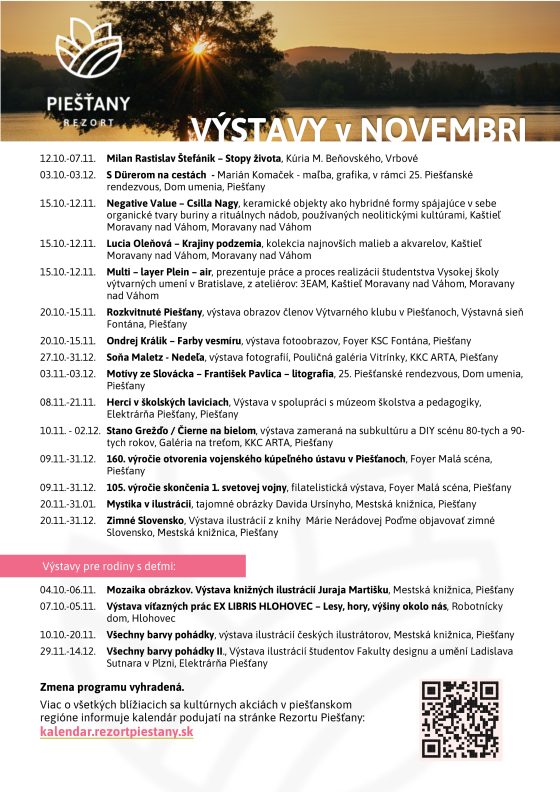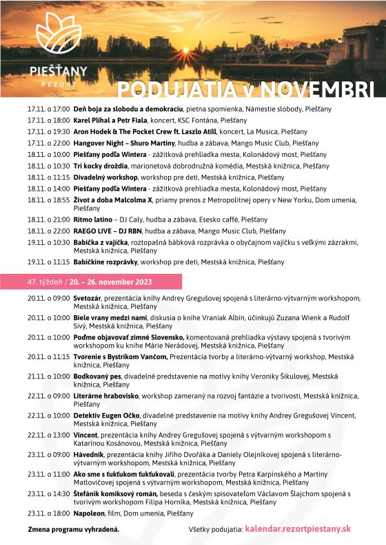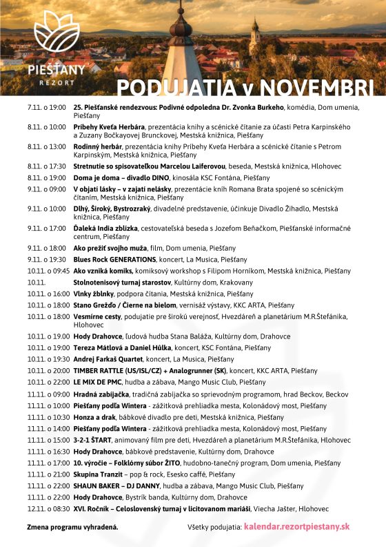 Piešťany sú známe ako mesto, kde to žije a piešťanský región je regiónom podujatí. Potvrdzuje to aj bohatý novembrový kalendár, ktorý zverejnil Rezort Piešťany. Ponúka divadelné a filmové predstavenia, koncerty, výstavy, hody aj klubovú zábavu, na svoje si príde každý. November sa bude niesť aj v znamení príprav na adventné obdobie a blížiace sa vianočné sviatky.