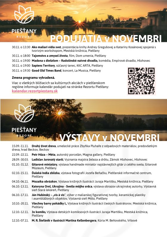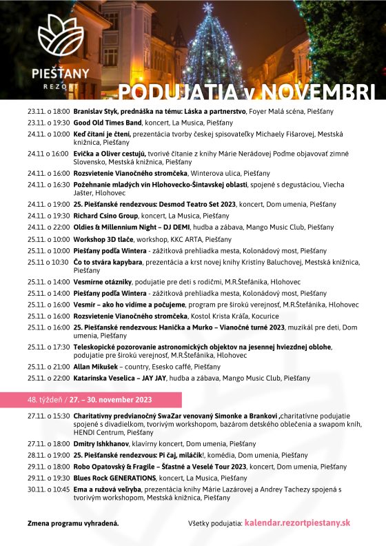 Predposledný mesiac roka sa v piešťanskom regióne ponesie v znamení kultúry a zábavy. Na konci novembra sa rozsvieti vianočný stromček. Oblastná organizácia cestovného ruchu Rezort Piešťany pozýva na desiatky podujatí, ich kompletný aktualizovaný prehľad je dostupný v online kalendári .