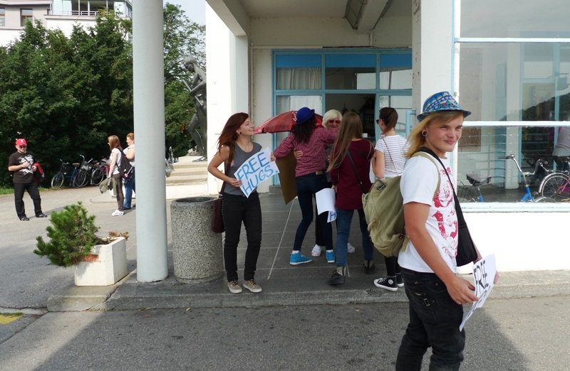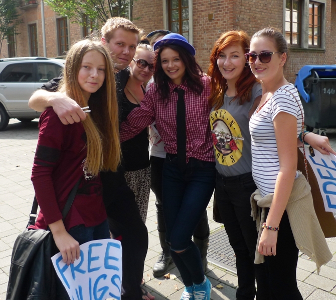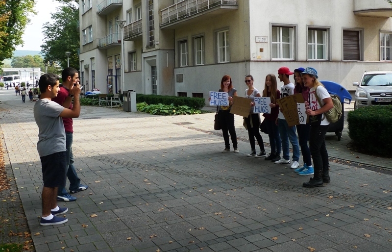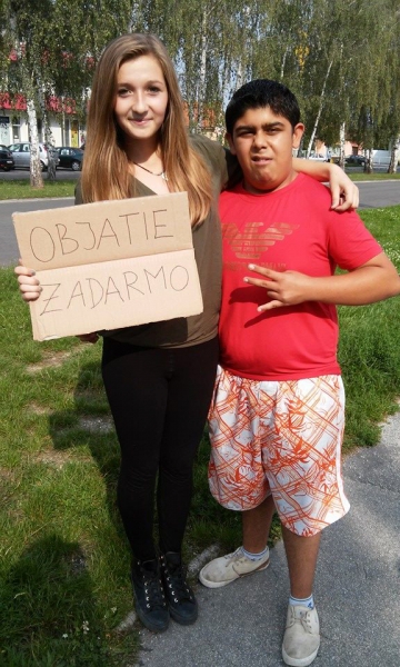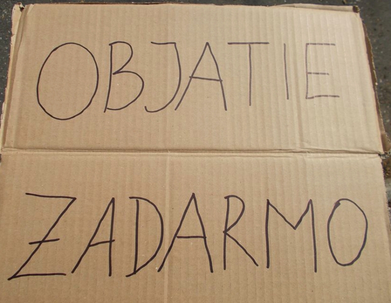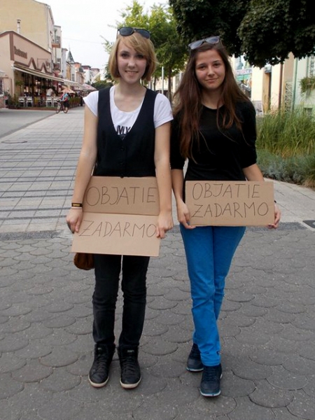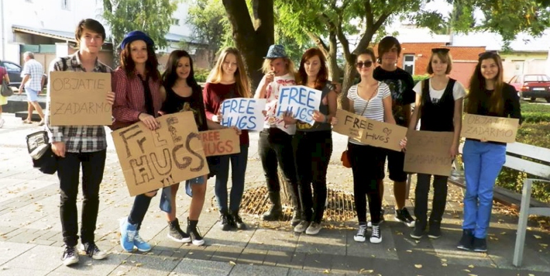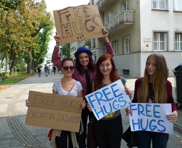 Skupinu tvorili prevažne stredoškoláci z Piešťan a okolia – z Vrbového, Ostrova či Šterús, v rukách držali kartóny s nápisom FREE HUGS alebo OBJATIE ZADARMO a ponúkali okoloidúcim objatie zdarma.