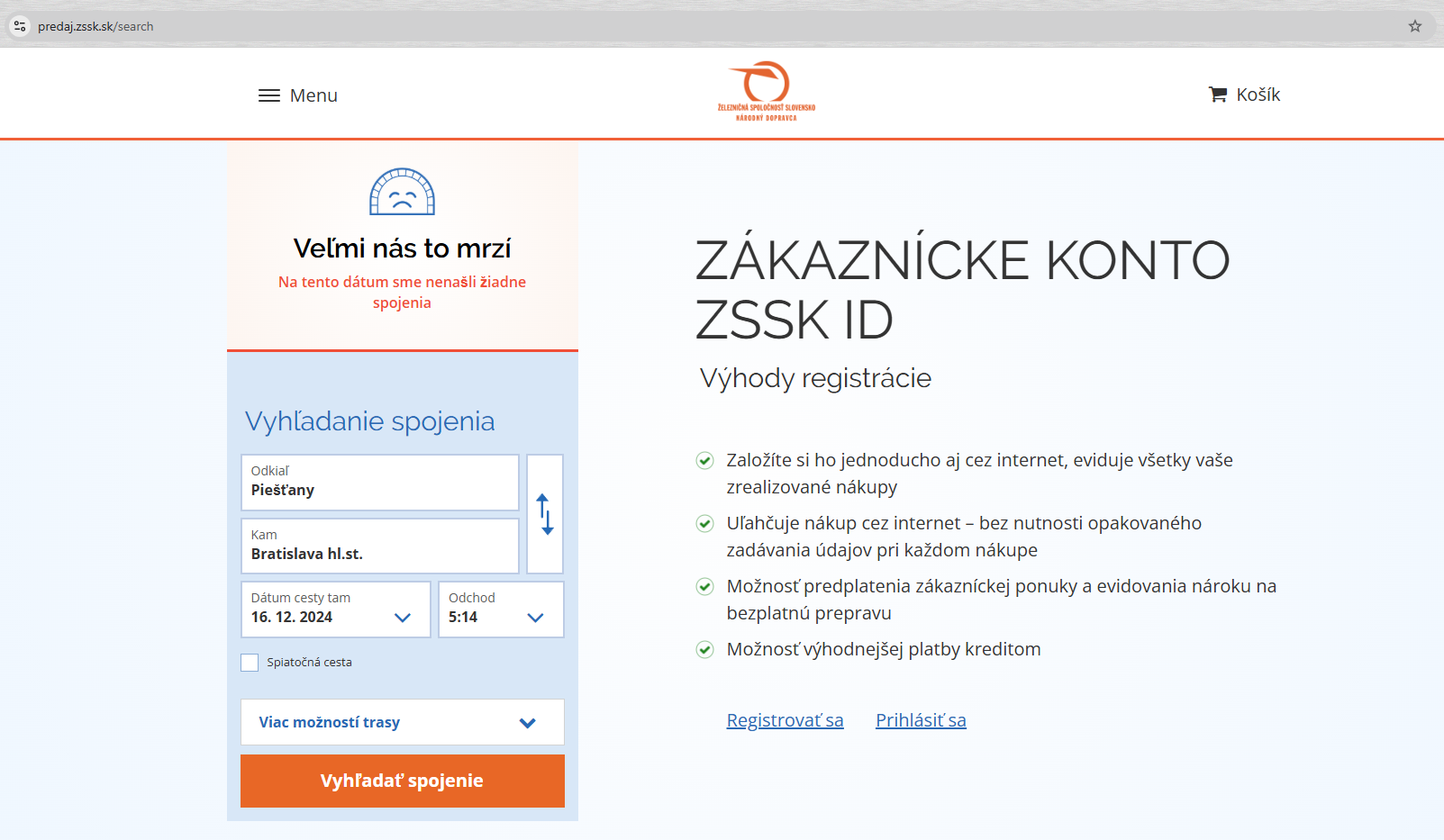 „Veľmi nás to mrzí. Na tento dátum sme nenašli žiadne spojenia,“ to je hláška systému predaj.zssk.sk pre dátum 16. december 2024. Rovnako je to aj v aplikácii Ideme vlakom, ktorú prevádzkuje Železničná spoločnosť Slovensko. Ak si teda plánujete cestu po polovici decembra, je to celkom komplikované, keďže dopravca databázu v týchto systémoch ešte nenaplnil údajmi z nového grafikonu.