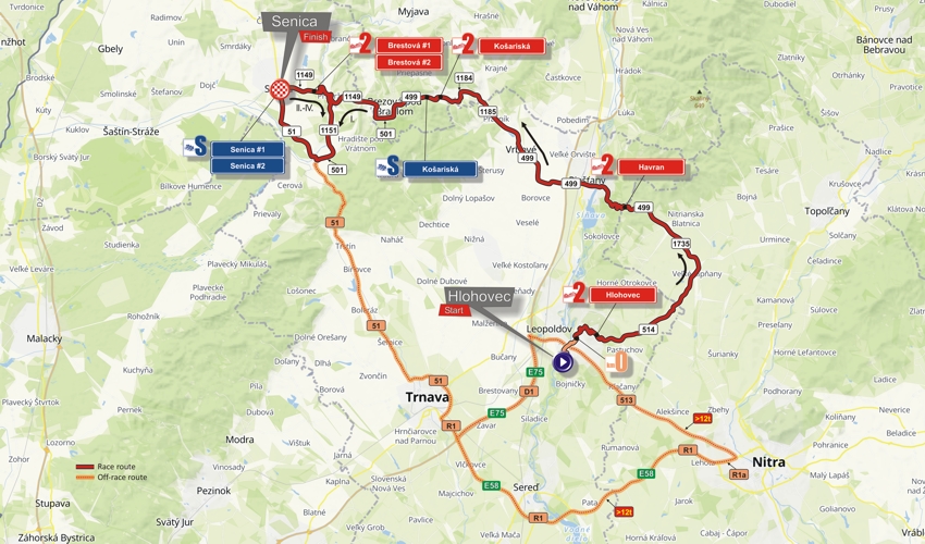 Pretekári sa z Hlohovca vydajú na Holý vrch, kde ich hneď po troch kilometroch od ostrého štartu čaká vrchárska prémia druhej kategórie. Pokračovať budú cez Dolné Trhovište, Merašice, Veľké Ripňany, Behynce, do Radošiny a odtiaľ na ďalšiu vrchársku prémiu na Havrane. Nasledovať bude zjazd cez Banku do Piešťan. Pretekári by mali doraziť na Krajinský most okolo 11:15 h. Pokračovať budú cez Trebatice, Vrbové, Prašník na Košariská a ďalej smerom do Senice.