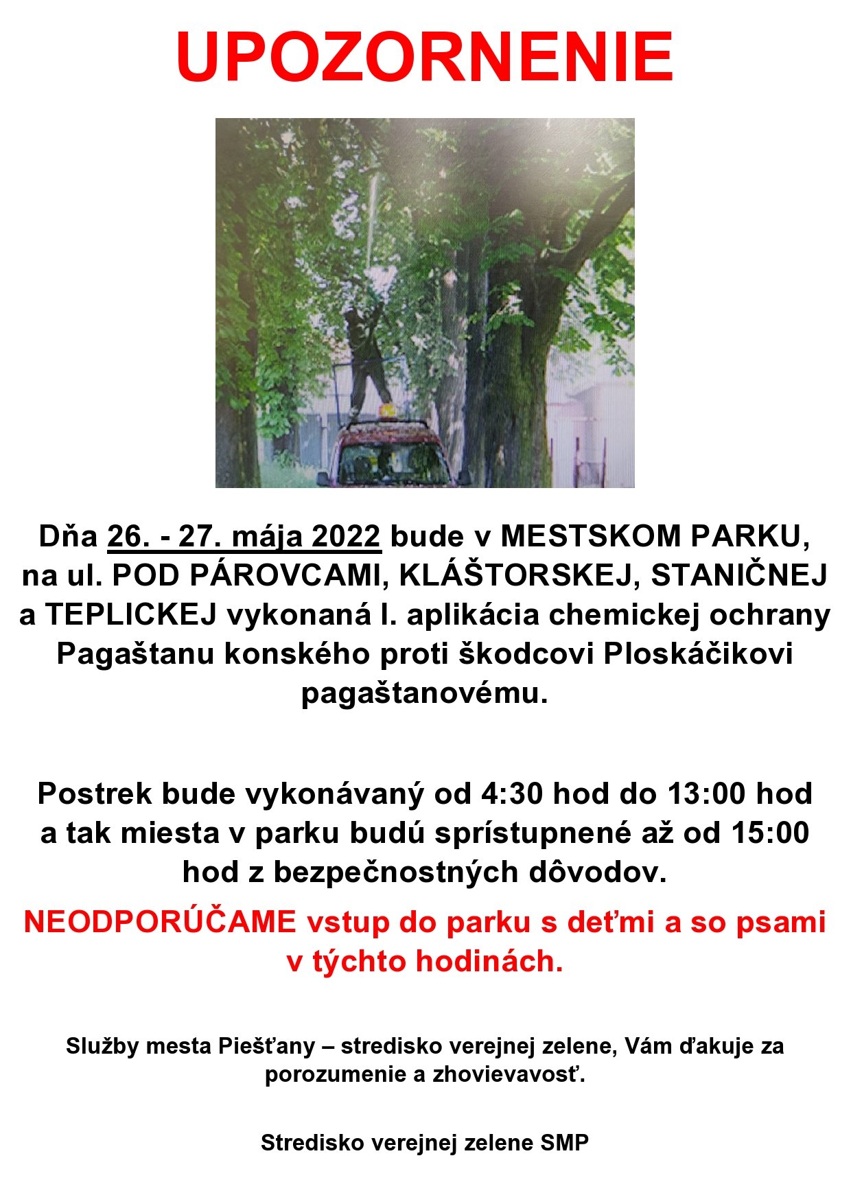 Vo štvrtok 26. a v piatok 27. mája 2022 bude v Mestskom parku, na ulici Pod Párovcami, na Kláštorskej, Staničnej a Teplickej ulici vykonaná I. aplikácia chemickej ochrany Pagaštanu konského proti škodcovi Ploskáčikovi pagaštanovému.