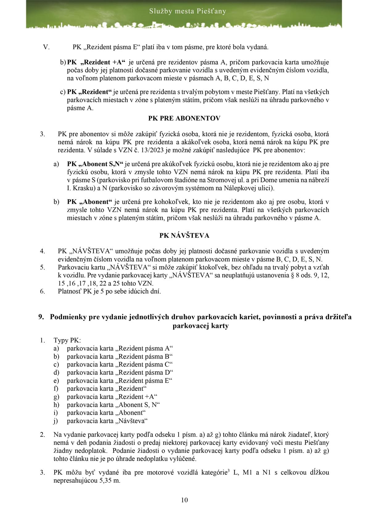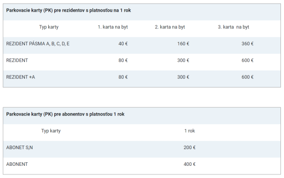 Abonent je akákoľvek právnická alebo fyzická osoba, ktorá nie je rezidentom mesta. Na vydanie ročnej neprenosnej parkovacej karty má nárok akákoľvek právnická alebo fyzická osoba, ktorá nie je rezidentom mesta. S parkovacou kartou abonent nie je možné parkovať v pásme A, na parkovisku s automatickým závorovým systémom na Nálepkovej ulici je ju naopak možné využiť.