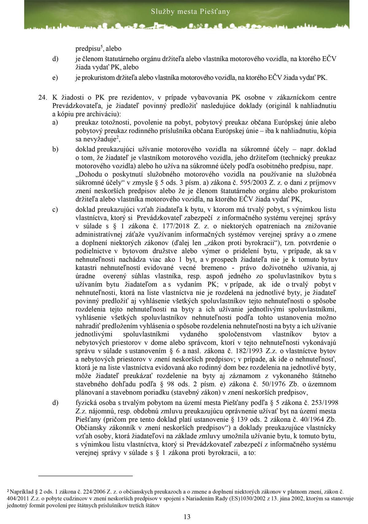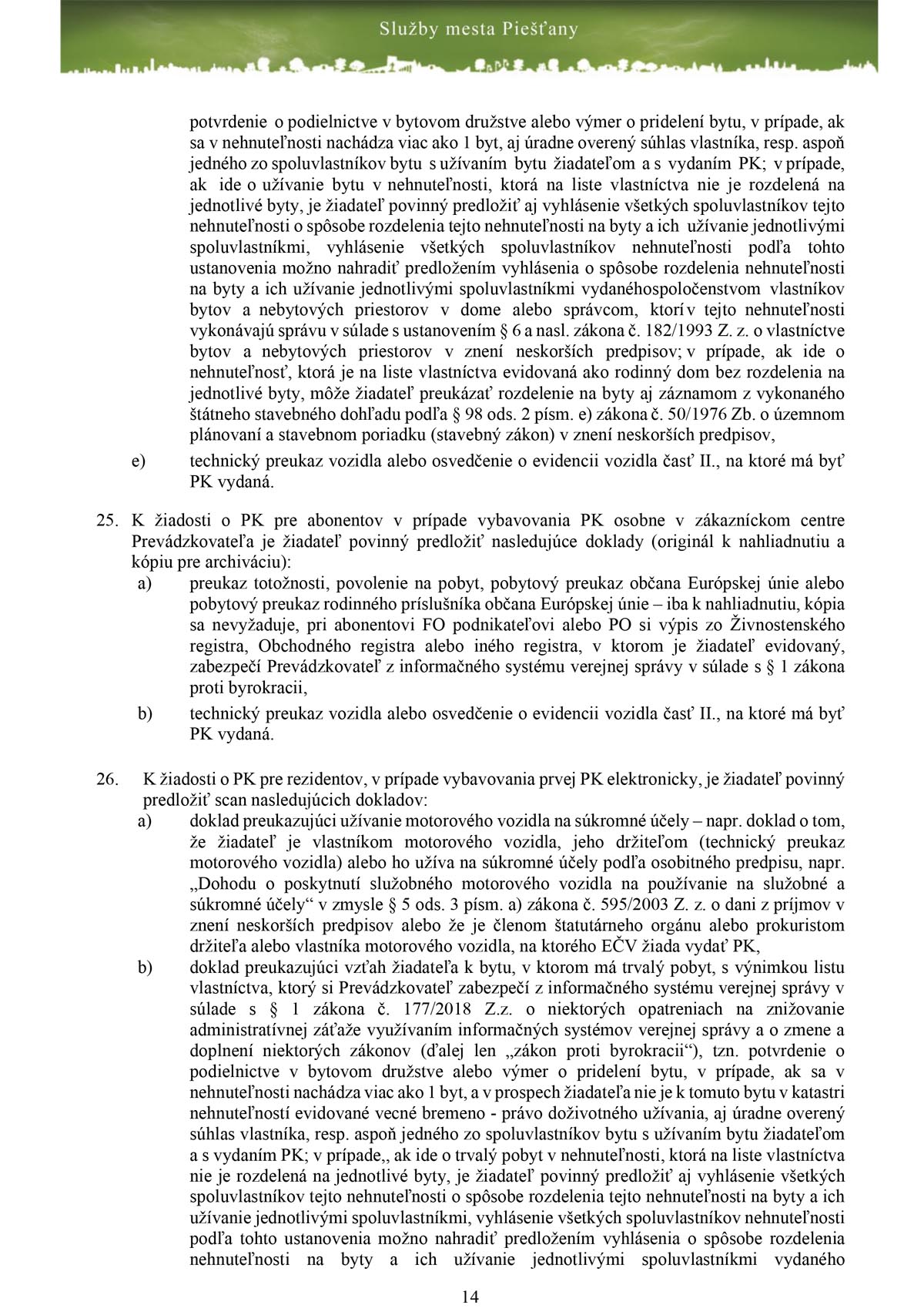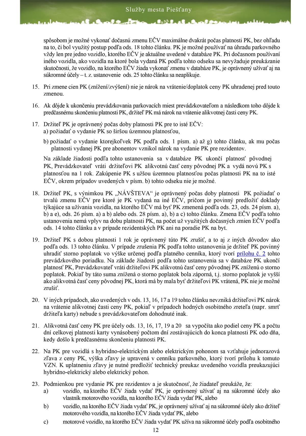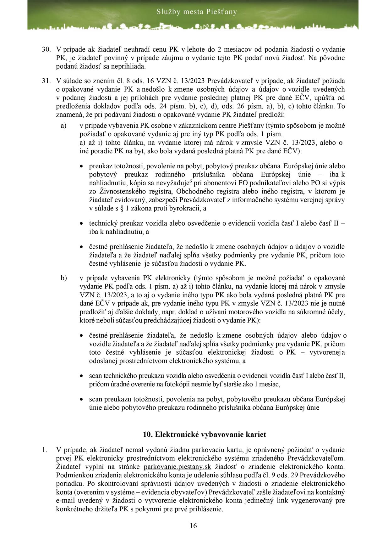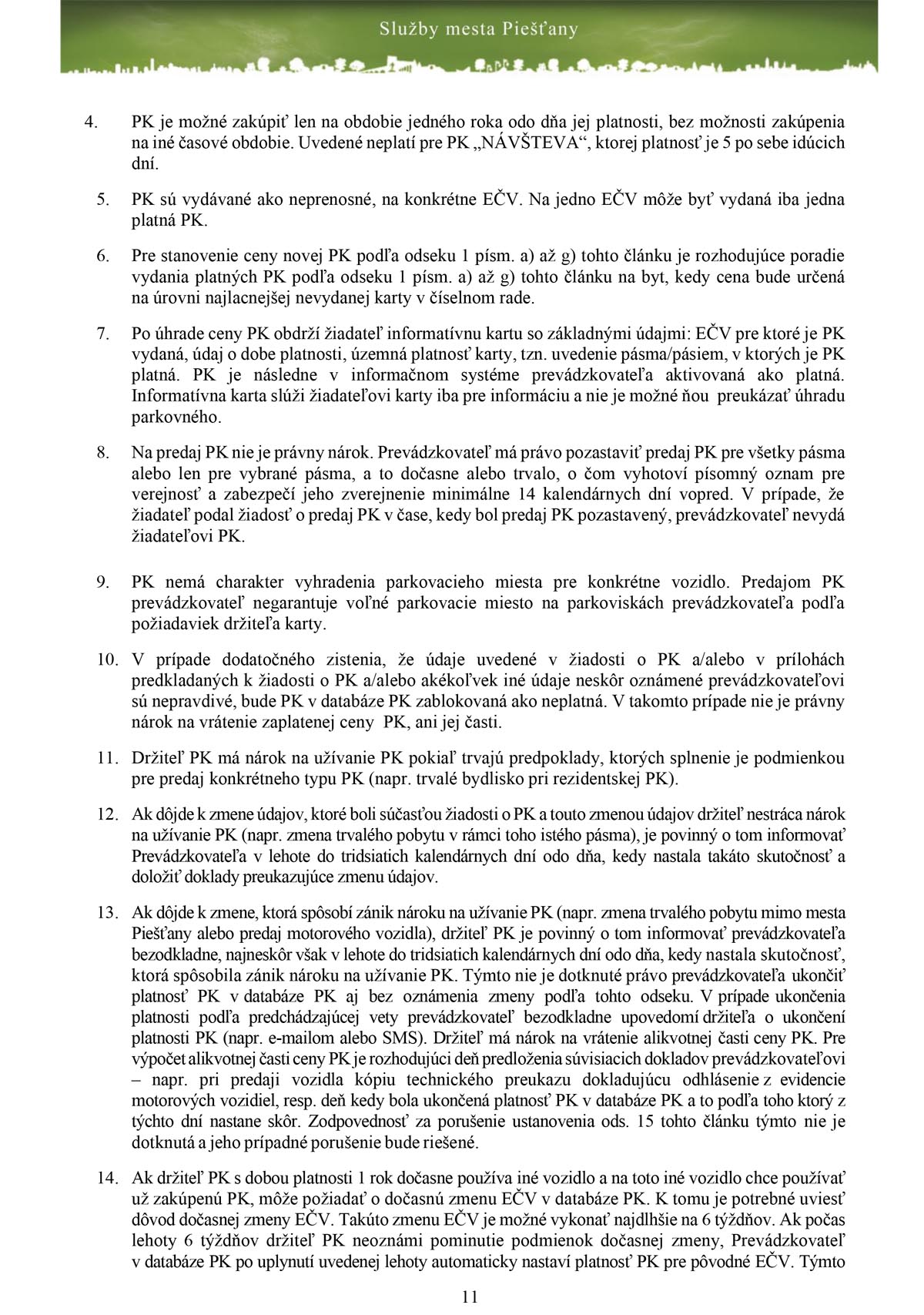 Detaily zakúpenia parkovacích kariet obsahuje Prevádzkový poriadok zóny s plateným státím v meste Piešťany, ktorý vydali Služby mesta Piešťany. Jednou z dôležitých vecí je, že karta začína platiť až po prijatí platby. Nestačí teda, že ste odoslali všetky dokumenty, musíte počkať na pripísanie platby za konkrétnu parkovaciu kartu na bankový účet Prevádzkovateľa pričom budete o tejto skutočnosti informovaný a zároveň vám oznámia dátum začatia platnosti parkovacej, ktorý je podľa termínu uvedeného v žiadosti, nie však skôr, ako po prijatí platby za parkovaciu kartu.