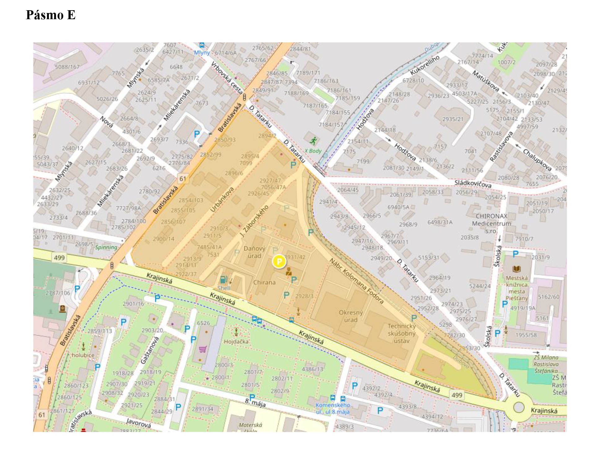 Tomu zodpovedá aj informácia zverejnená dnes Službami mesta Piešťany na webovej stránke www.sluzbymesta.sk: „Pásmo E – administratívna zóna, nachádza sa medzi ulicami Bratislavská, Krajinská, Nábrežie Kolomana Fodora. V tomto pásme podnikateľské subjekty a administratíva zabezpečujú parkovanie na vlastných pozemkoch, avšak aj tu je potreba verejných parkovacích miest s akceptovaním dlhodobého státia. Regulácia parkovania v tomto pásme bude zavedená po realizácii normových parkovacích miest a príslušného dopravného značenia. V súčasnosti nie je spoplatnené pásmo E.“