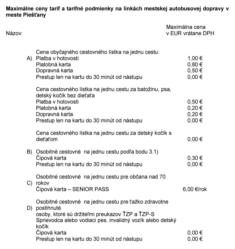Mesto Piešťany plánuje od nového roka zmeny v cenách lístkov mestskej autobusovej dopravy na svojom území. O tejto téme sa hovorilo minulý týždeň na verejnom prerokovaní aktualizácie Optimalizácie MAD v Piešťanoch, ale konkrétne čísla nepadli. Samospráva pripravila aktuálne materiál pre mestské zastupiteľstvo a už dnes o ňom budú rokovať jeho komisie. V zverejnených návrhoch je uvedené, že cena za cestovný lístok platený hotovosťou by mala stúpnuť z 0,5 eur na 1 euro. Ak budú cestujúci používať dopravnú kartu, navrhuje sa minimálny nárast ceny z aktuálnych 0,49 eur na 0,5 eur.