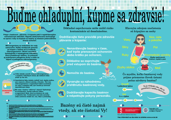 Úrad verejného zdravotníctva Slovenskej republiky koncom minulého týždňa vydal leták, ktorý vytvorili odborníci z Regionálneho úradu verejného zdravotníctva so sídlom v Poprade a Úradu verejného zdravotníctva Slovenskej republiky. Informatívny plagát sprostredkováva základné rady ako sa kúpať bez obáv o zdravie, od júla bude k dispozícii na všetkých umelých kúpaliskách na Slovensku. Najdôležitejším bodom je samozrejme ohľaduplnosť, pričom ľudia by nemali navštevovať bazény v čase keď trpia prenosným ochorením, pred vstupom do vody by sa mali dôkladne vysprchovať a dôležité je hlavne nevykonávať malú potrebu priamo do bazéna.