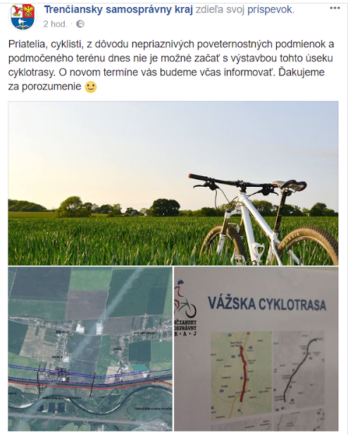 V pondelok 9. októbra dopoludnia zavesili na FB stránku kraja nasledovný oznam: „Priatelia, cyklisti, z dôvodu nepriaznivých poveternostných podmienok a podmočeného terénu dnes nie je možné začať s výstavbou tohto úseku cyklotrasy. O novom termíne vás budeme včas informovať. Ďakujeme za porozumenie :)“