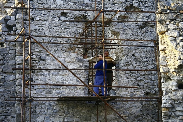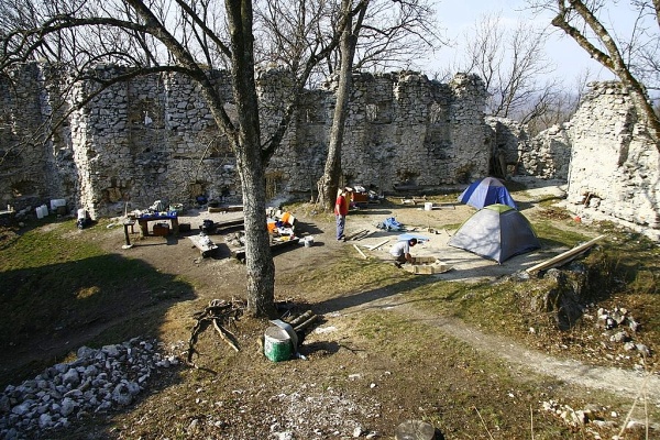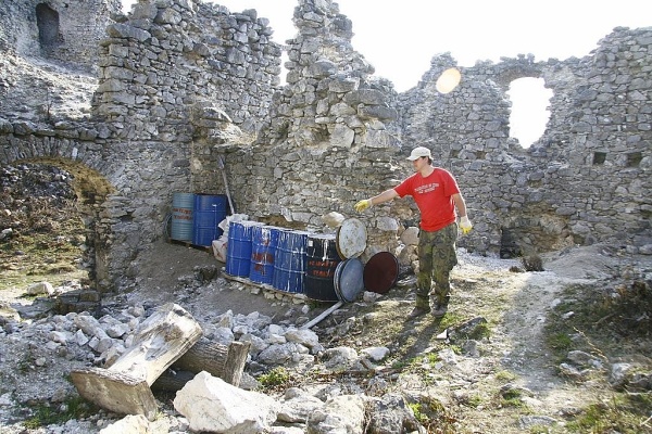 „Minulý víkend sme strávili pri prípravných prácach na murársku sezónu, takže sme hasili vápno, vyrábali debnenie pre murovanie záklenku, triedili kamenivo podľa rôznych veľkostí a tvarov, upratovali – zbierali rozfúkané odpadky po lese, zvážali sa deravé už nepoužiteľné sudy s bandaskami, upravovali sa chodníčky po hrade, pripravovalo sa lešenie, opravovali sa poškodené podlážky na lešenie a doviezli sme kameň vhodný do záklenku, ktorý sme potom fúrikovali na budúce „miesto činu“,“ vymenoval náplň víkendu na hrade Mojmír Choma z OZ Hrad Tematín.