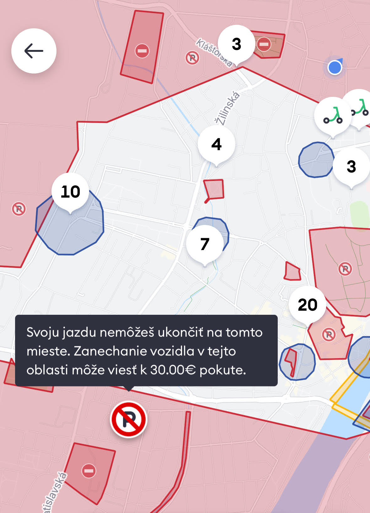 V červených zónach je parkovanie zakázané. „Jazda na kolobežke v červenej zóne je povolená. Ak jazdu ukončíte v tejto oblasti, môže vám byť účtovaná pokuta,“ popisujú prevádzkovatelia. V červených zónach so zákazom vstupu nie je možné parkovanie ani jazda. V tmavo modrej zóne sú definované povinné parkovacie miesta.