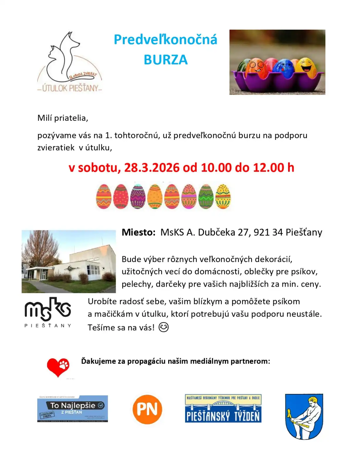 V sobotu 28. marca sa uskutoční prvá tohtoročná burza na podporu piešťanského útulku. Príďte si nakúpiť a pomôcť zvieratám, ktoré zostali opustené.