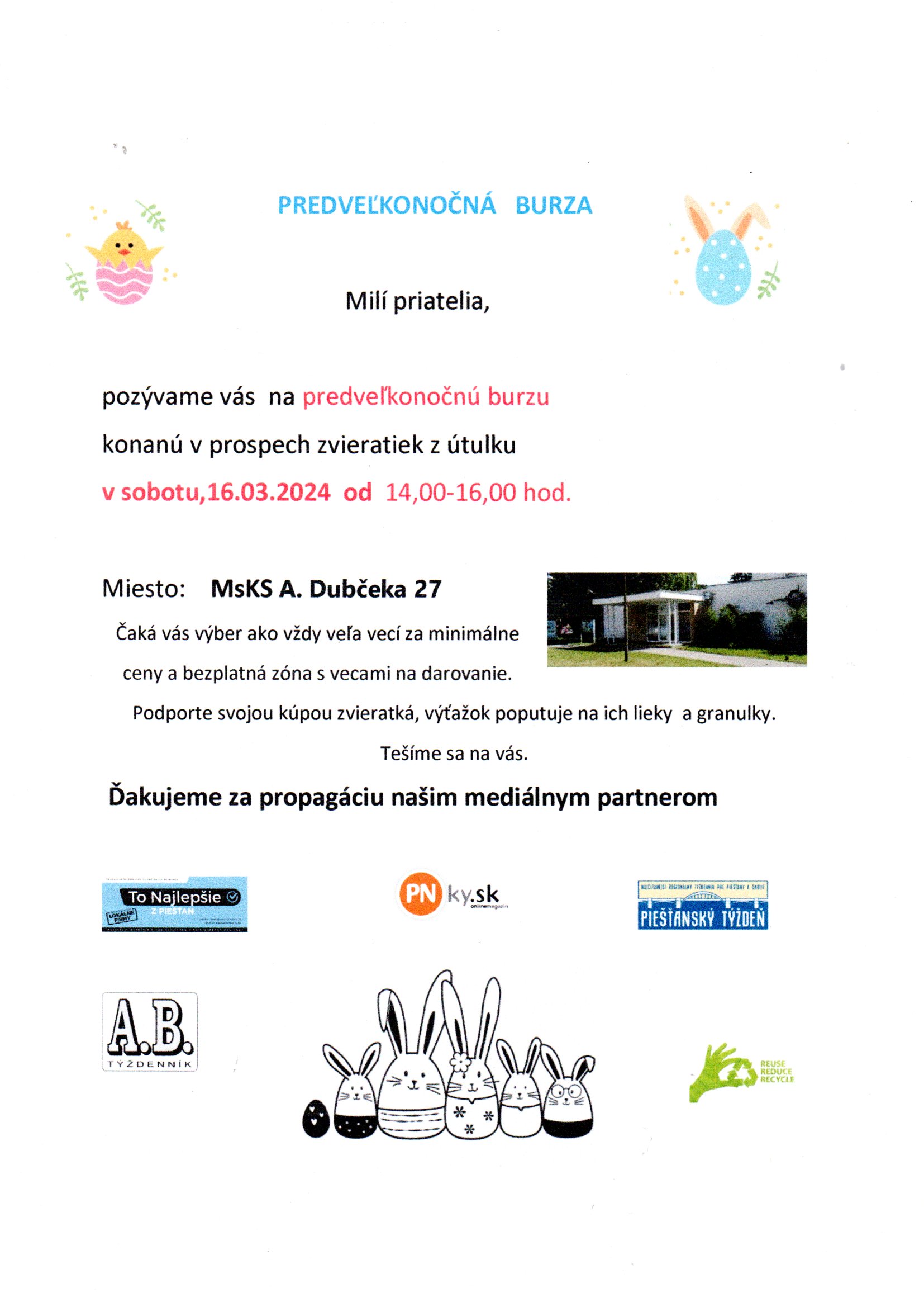 V sobotu 16. marca od 14:00 do 16:00 h na Malej scéne MsKS (A. Dubčeka 27) v Piešťanoch môžete podporiť „útulkáčov“. Čaká vás ako vždy veľa vecí za minimálne ceny i zóna na bezplatné darovanie. Vďaka vášmu „nákupu“ budú môcť v piešťanskom útulku nakúpiť za získané prostriedky lieky a krmivo pre zvieratá.