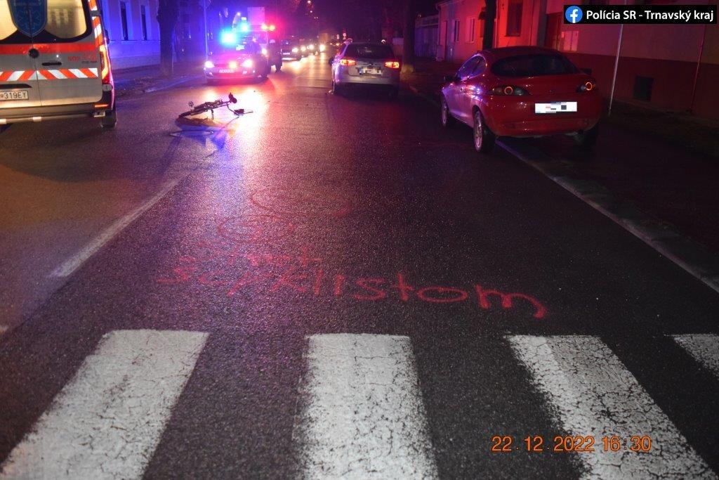 Vo štvrtok (22.12.2022) došlo, krátko po 16:00 h, k zrážke auta VW Passat a staršieho muža na bicykli, tzv. skladačke. Podľa prvotných informácií mal cyklista pri prechádzaní cez križovatku prejsť do protismeru. V tom čase tadiaľ prechádzala 40 ročná vodička, ktorá už nestihla zareagovať a došlo k zrážke. Pri nehode utrpel 73 ročný muž zranenia, s ktorými ho záchranári previezli do piešťanskej nemocnice.