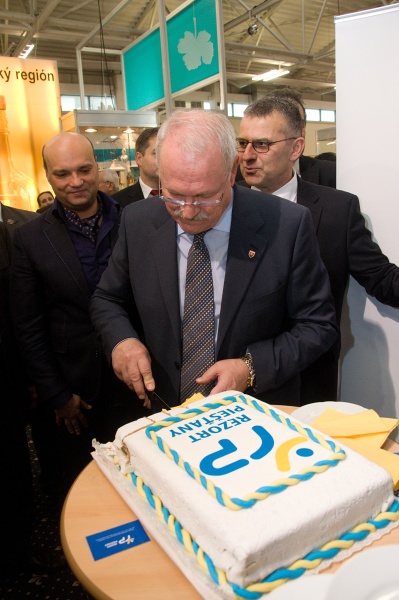 Logo Rezortu Piešťany zdobilo aj tortu, ktorú do piešťanského stánku prišiel rozkrojiť prezident Ivan Gašparovič, ktorý má záštitu nad celým podujatím. ITF Slovakiatour potrvá do nedele 27. januára.