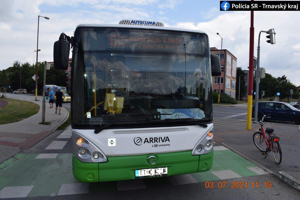V Trnave, pri prejazde križovatky ulíc Špačinská a Rybníkova, zrazil autobus MHD 63 ročnú cyklistku, ktorá prechádzala po priechode pre cyklistov. Cyklistka utrpela pri zrážke zranenia, s ktorými ju RZP dostala na ošetrenie do trnavskej nemocnice.