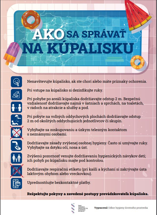 Tohtoročnú kúpaciu sezónu na umelých a prírodných kúpaliskách ovplyvňujú protiepidemické opatrenia prijaté pre pandémiu ochorenia COVID-19. Úrad verejného zdravotníctva Slovenskej republiky odporúča nenavštevovať kúpalisko, ak ste chorí alebo máte príznaky ochorenia, ohrozujete tým seba aj ostatných.