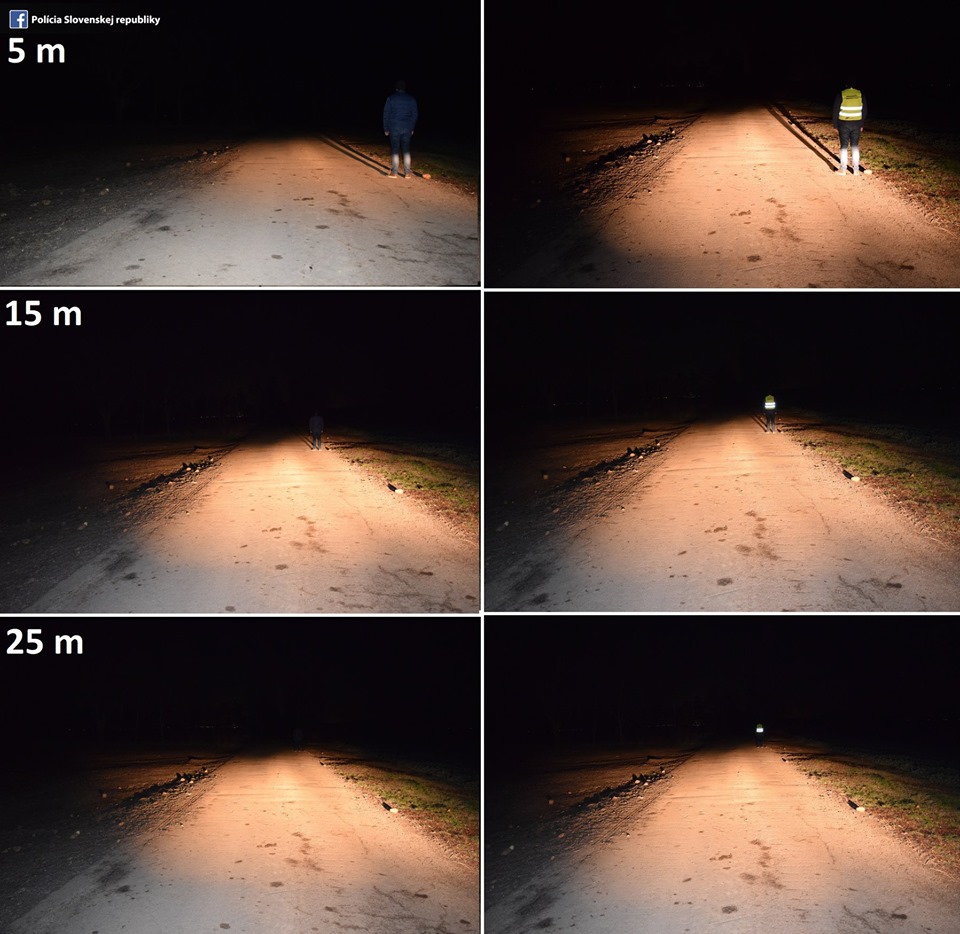 Policajti pripomínajú, že za zníženej viditeľnosti musí mať chodec idúci po krajnici alebo po okraji vozovky na sebe viditeľne umiestnené reflexné prvky alebo oblečený reflexný bezpečnostný odev. Zverejnili  tiež  koláž  fotografií ako je viditeľný chodec z pohľadu vodiča pri rôznych vzdialenostiach s reflexnými prvkami a bez nich.